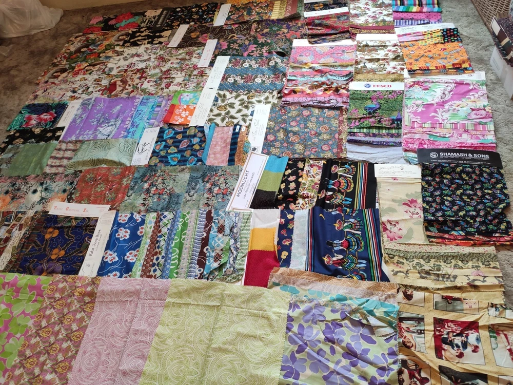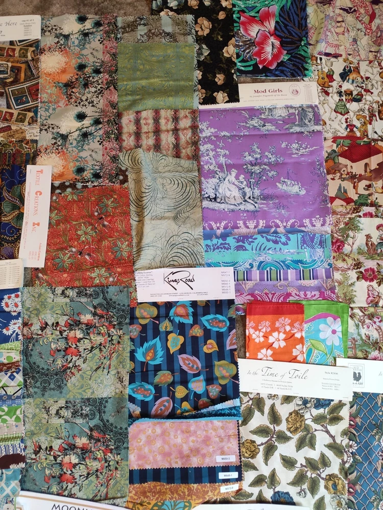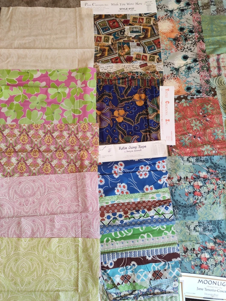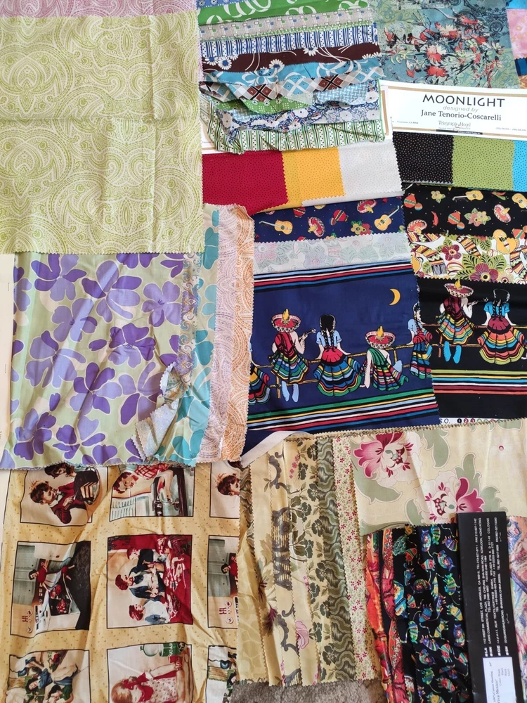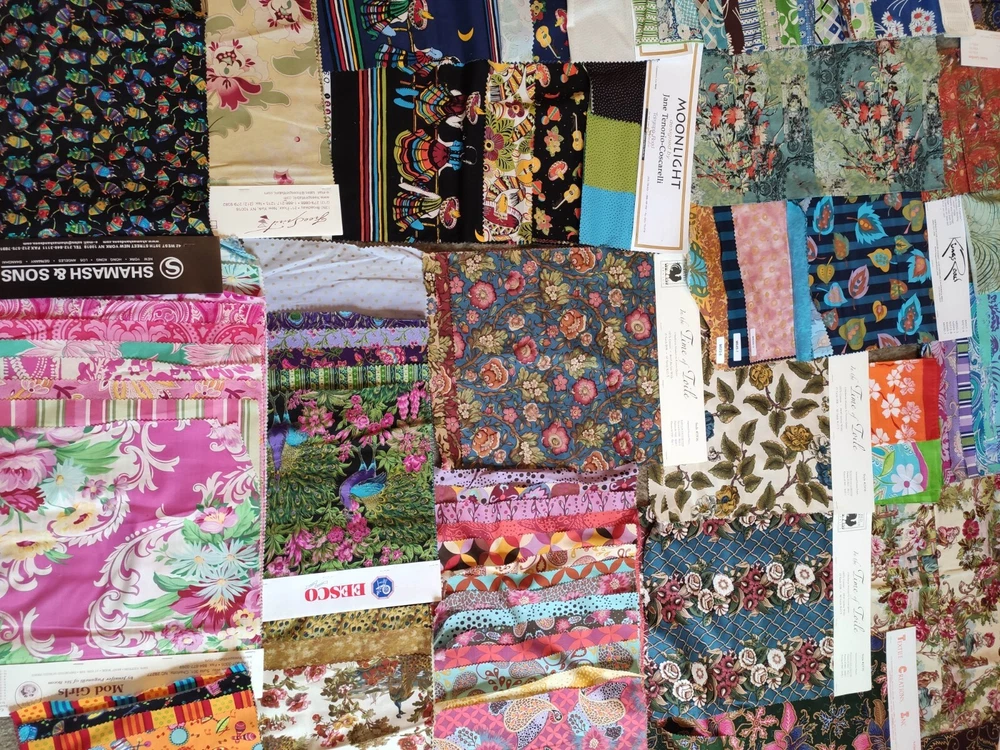 This lot of fabric includes a variety of brands, patterns, and colors, Alexander Henry, Griffin, Rooster, batik, toile, retro prints. The lot contains yardage suitable for quilting and crafting, and is perfect for those looking to expand their collection. Whether you're a seasoned quilter or just starting out, this lot is sure to inspire creativity. Some full yards, with average size being about quarter yard, and some a bit smaller.