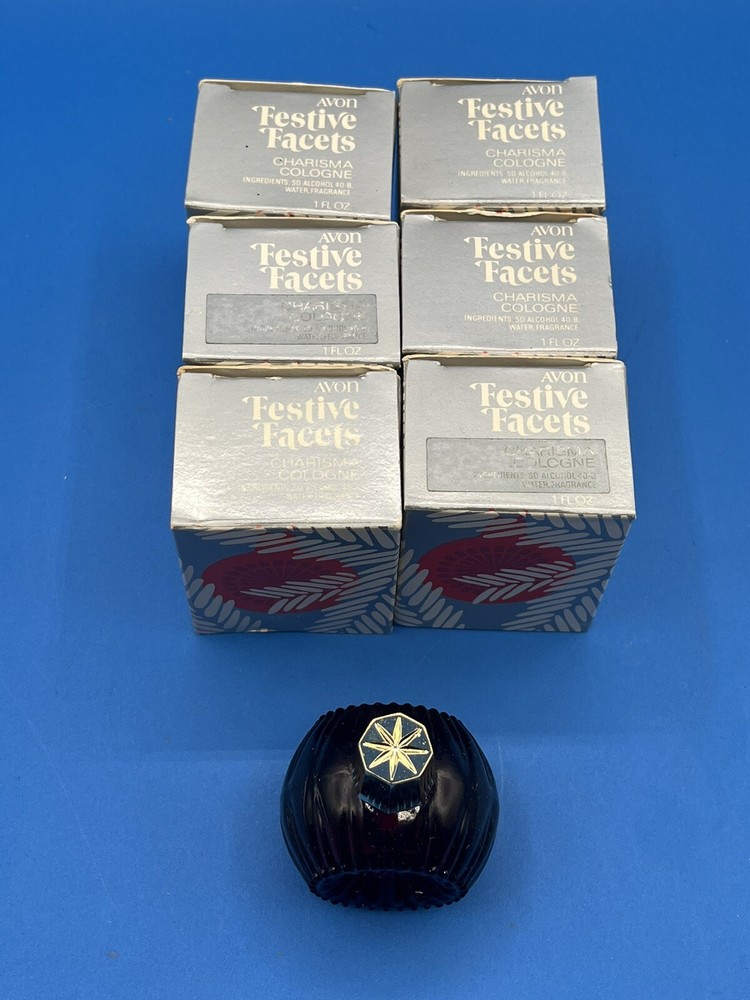 Lot 6 Vtg Avon Festive Facets Cologne 1fl oz Ornaments Red & Green “Charisma”.