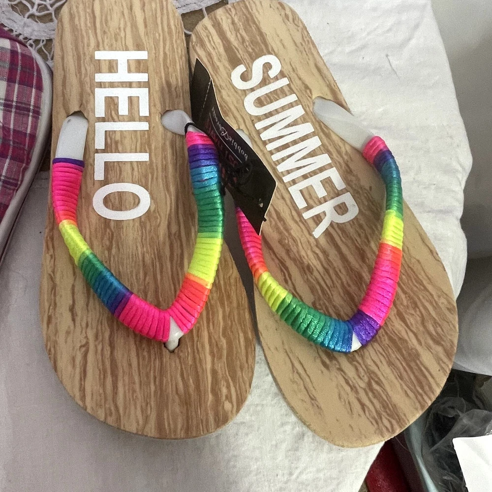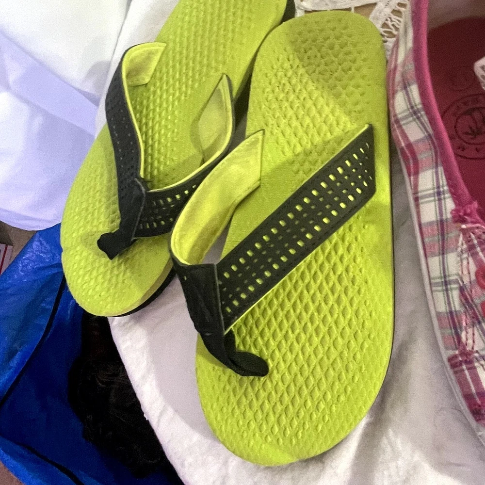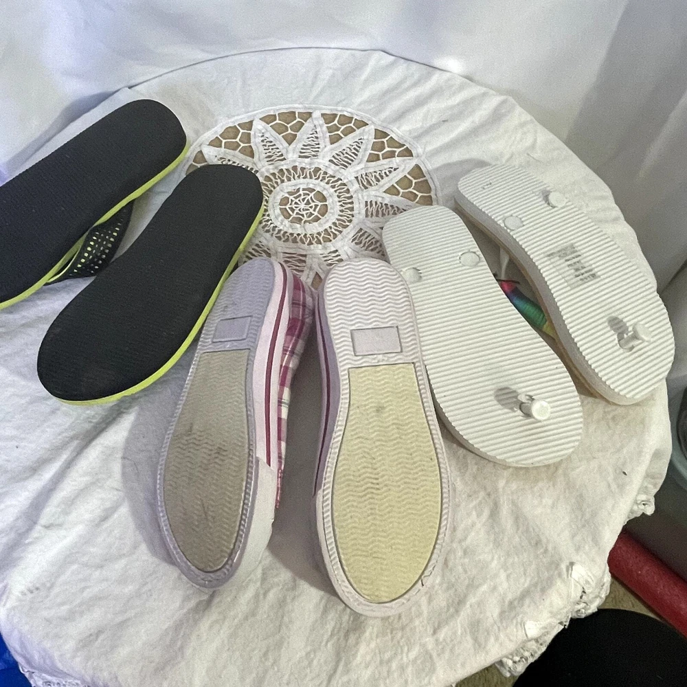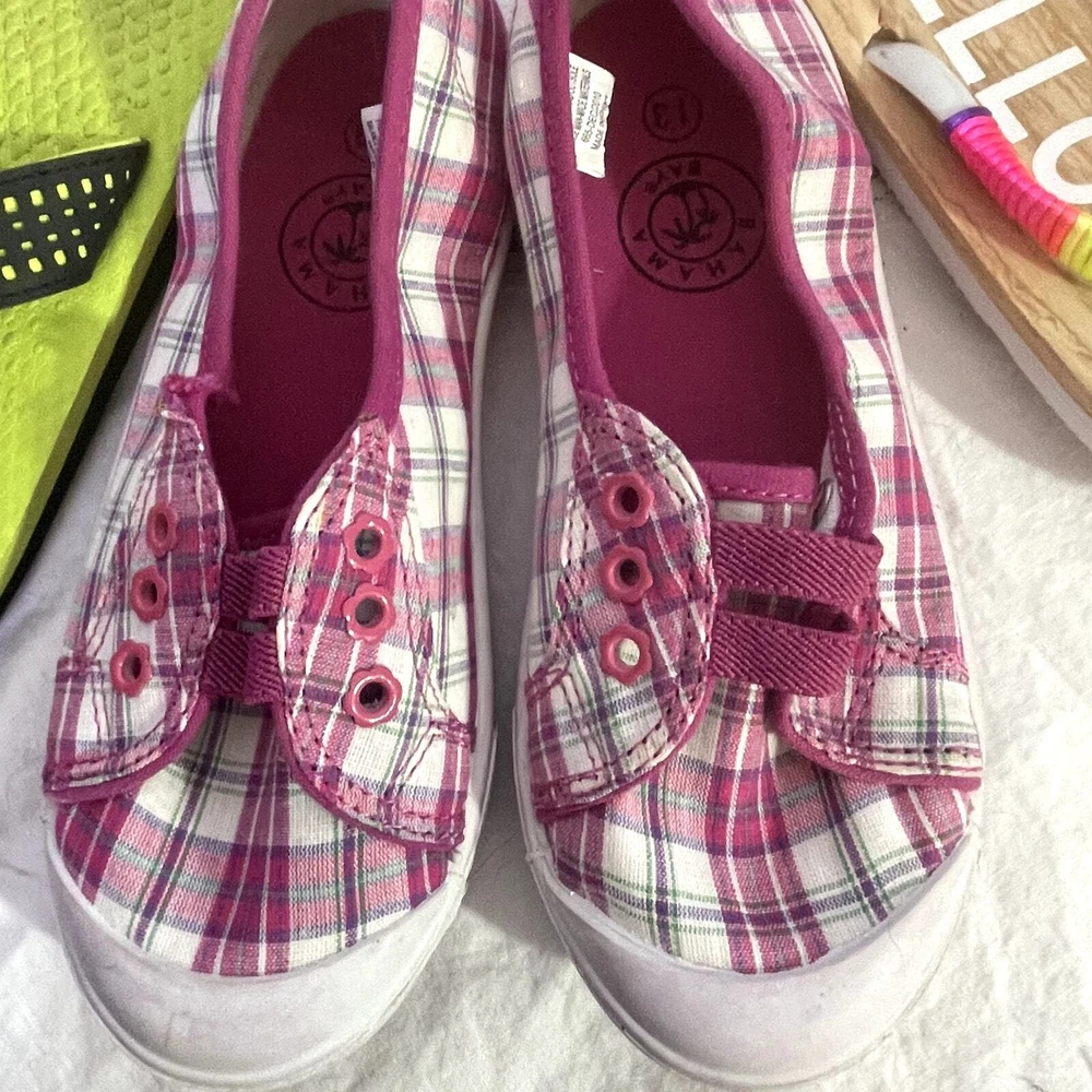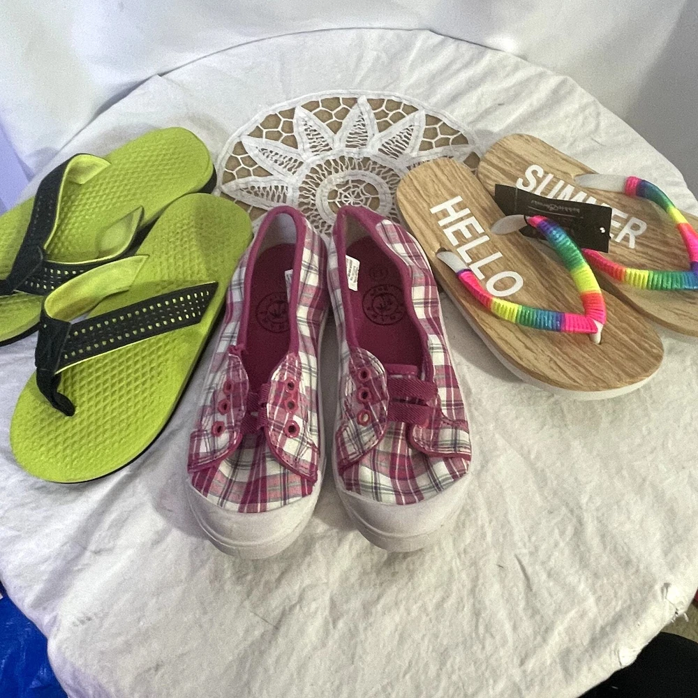 Lot Bundle of 3 pair of Girl's shoes 2 flip-flops 11/12 1 sneakers 13 Flip flops NWT New with tags multi-color 11/12 other worn with neon green and black sneakers Bahama Bay size 13 pink and white check no strings You are Enough 1193 $10 2 lb