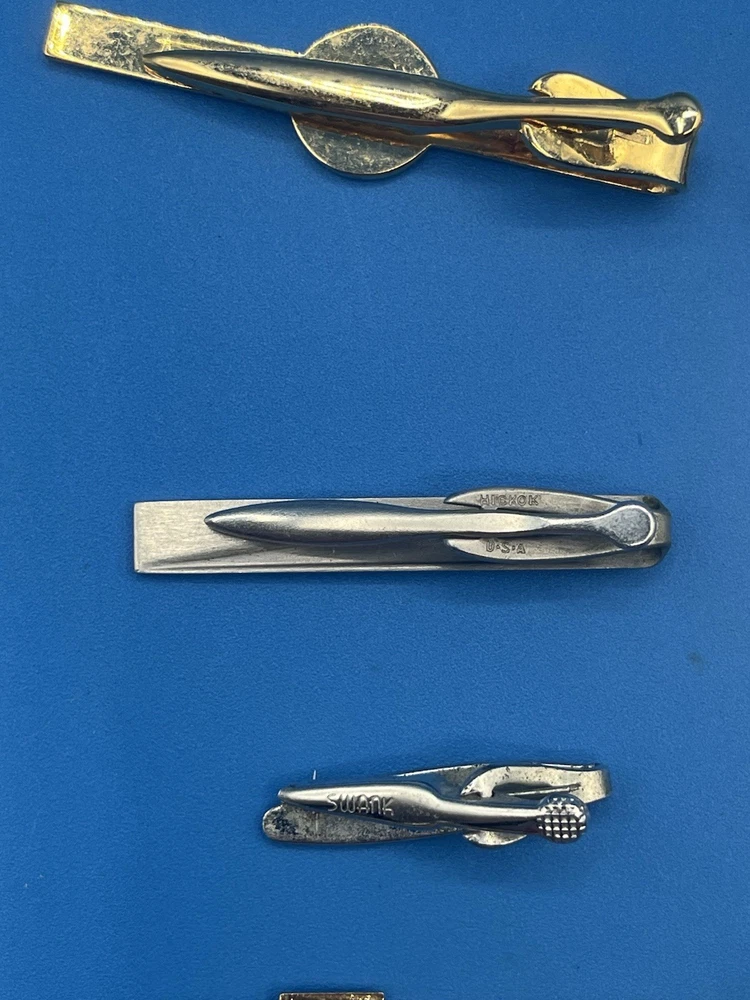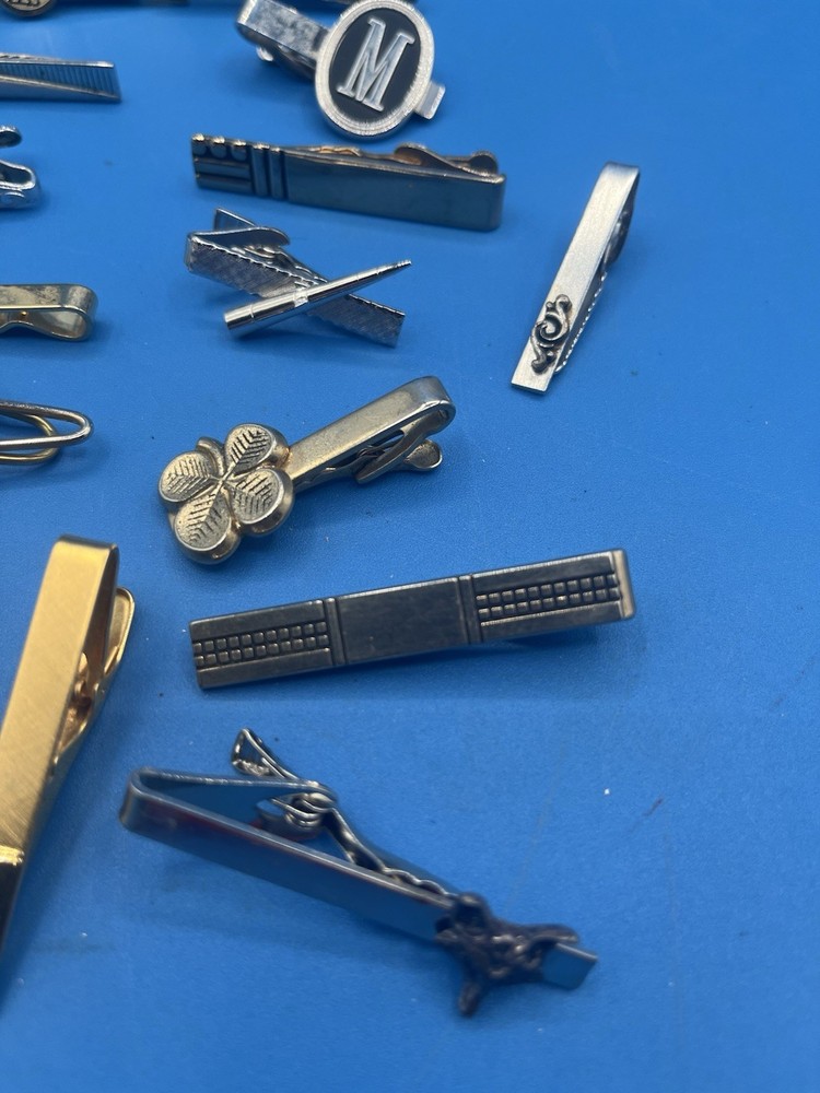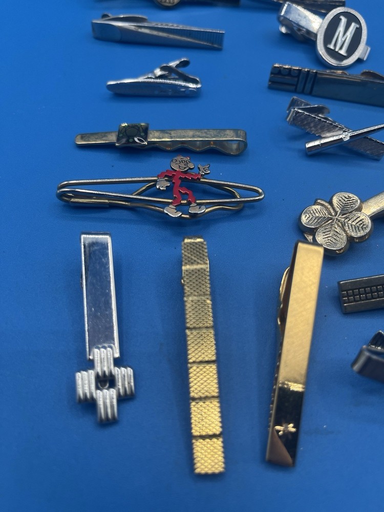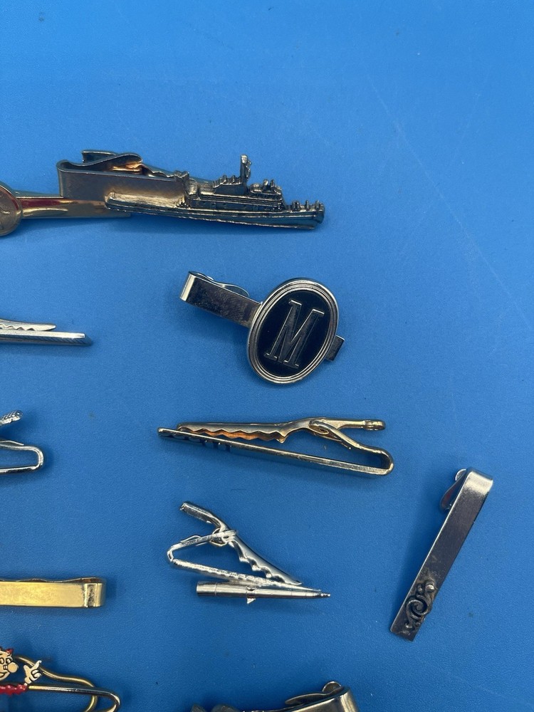 This lot of 16 vintage tie clasps and clips includes a variety of brands such as Swank, Hikok, Reddy, and Kilowatt. These stylish accessories are perfect for adding a touch of sophistication to any man's outfit. The tie bar/clip design ensures a secure and sleek hold for your favorite ties, making it a versatile addition to any wardrobe.