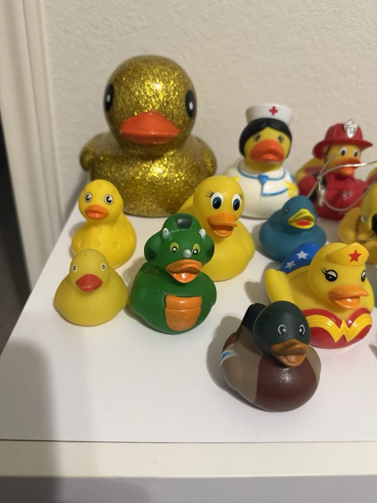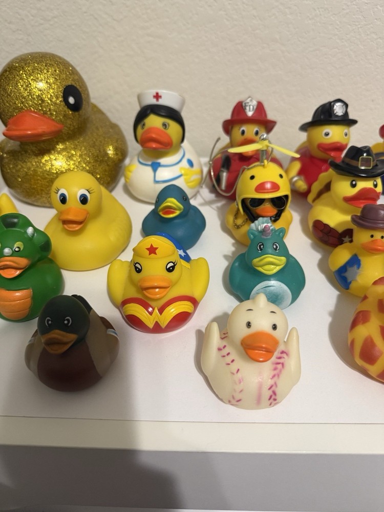 This lot of 20 rubber ducks in a variety designs These classic toys are part of the Rubber Ducks character family. Perfect for children or Adults who love collecting rubber ducks for their Jeep or playing with them in the bath, this set offers a fun and colorful addition to any toy collection. Witch, Ghost, Wonder Woman, mini duck, Cowboy, firefighter, nurse, Giraffe, baseball, Dinosaur, 2 mariachi Ducks and large Glitter Duck