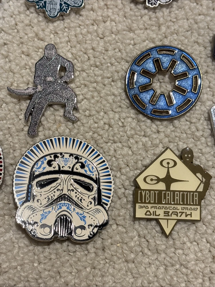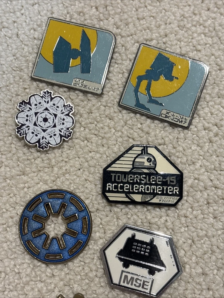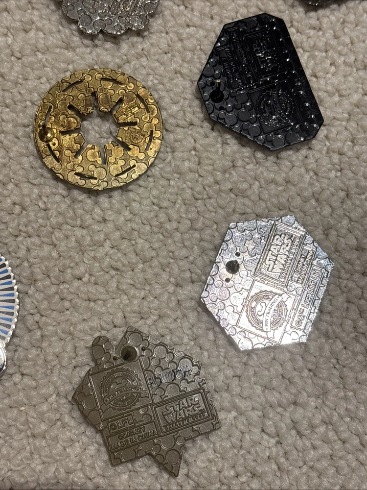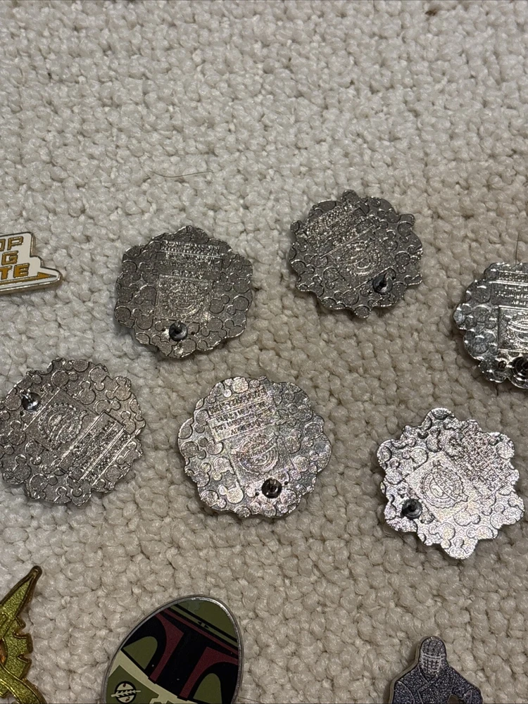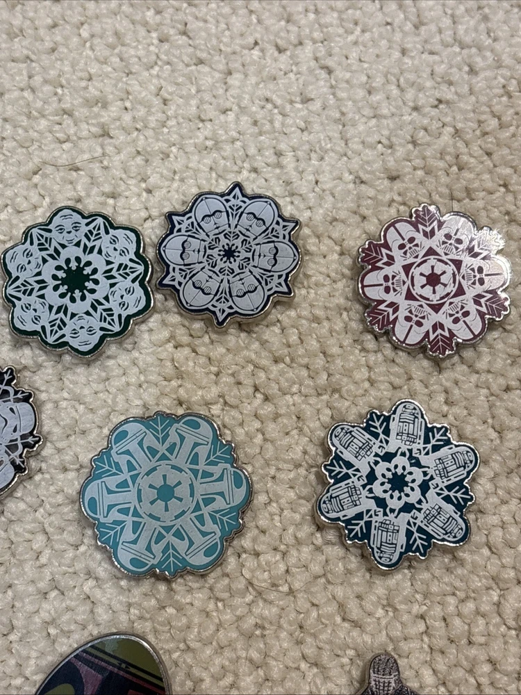 These are used star wars pins. This includes the 6 piece star wars snowflake set. Note that two pins have bent (but not wobbly) posts, as shown in photos.