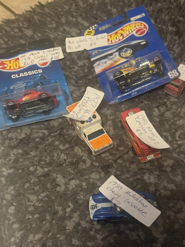 1) 1977 Matchbox ambulance made in china 2) Hot Wheels T-Bucket No. 68 (New in package) 3) 1984 Matchbox Corvette convertible 4) Newport Chevy truck made in Hong Kong 5) 1965 Matchbox Lesney 8 wheel crane 6) #11 Chevy corvette 7) Intex-Zee toys Kenworth W900 8) Porsche 911 silver made in Hong Kong 9) play Art firetruck made in Hong Kong 10) Commanders transformer, Motrin, McDonald’s 11) 1989 matchbox Chevy Corvette 12) 1980s BMW 325 I Cab convertible 13) corgi Mercedes made in Great Britain 14) 1970s six hot wheels US mail truck 15) 1975 hot wheels Ramblin wrecker 16) 1980 Kenner emergency unit two 17) majorette 275 Renault made in France 18) 1979 matchbox refuse truck UK 19) play custom van Hong Kong number four 20) 1980 hot wheels mini trek 21) 1977 hot wheels, red fire chief 22) 1984 hot wheels Pontiac Fiero zm4 23) majorette Lamborghini number 257 24) mercury State police car made in macaw