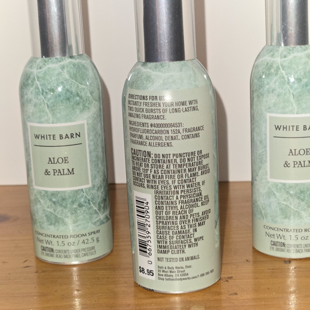 Size: Small Scent: ALOE & PALM Volume: 1.5 OZ Intended Use: Room Spray Brand: Bath & Body Works UPC: 0667559270904 Style: Traditional Department: Adults Features: Deodorizer Form: Spray Number in Pack: 3 Type: Room Spray gtin13: 0667559270904 Color: Blue