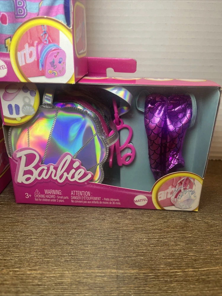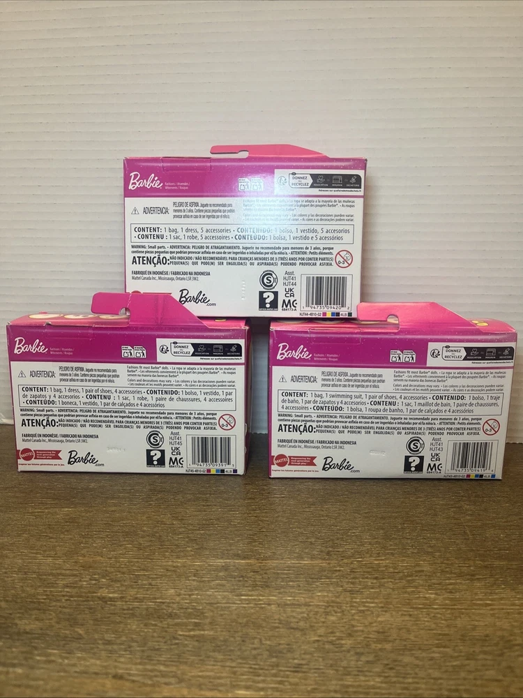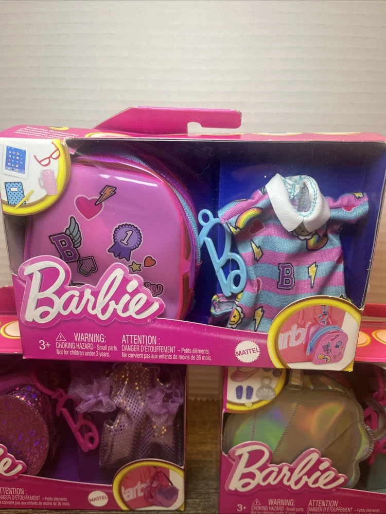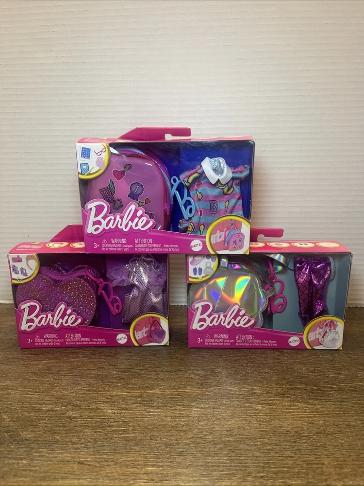 The product is a lot of three Barbie doll clothes accessory packs. Each pack includes an outfit themed accessory made of cloth material suitable for children aged 3 years and above. The Barbie brand is featured, making these sets ideal for doll playsets.