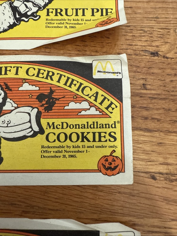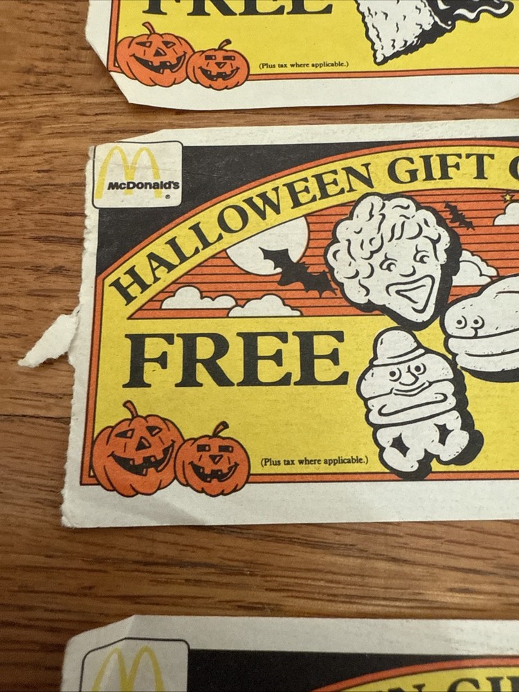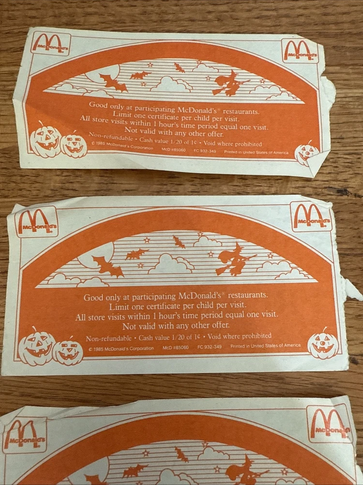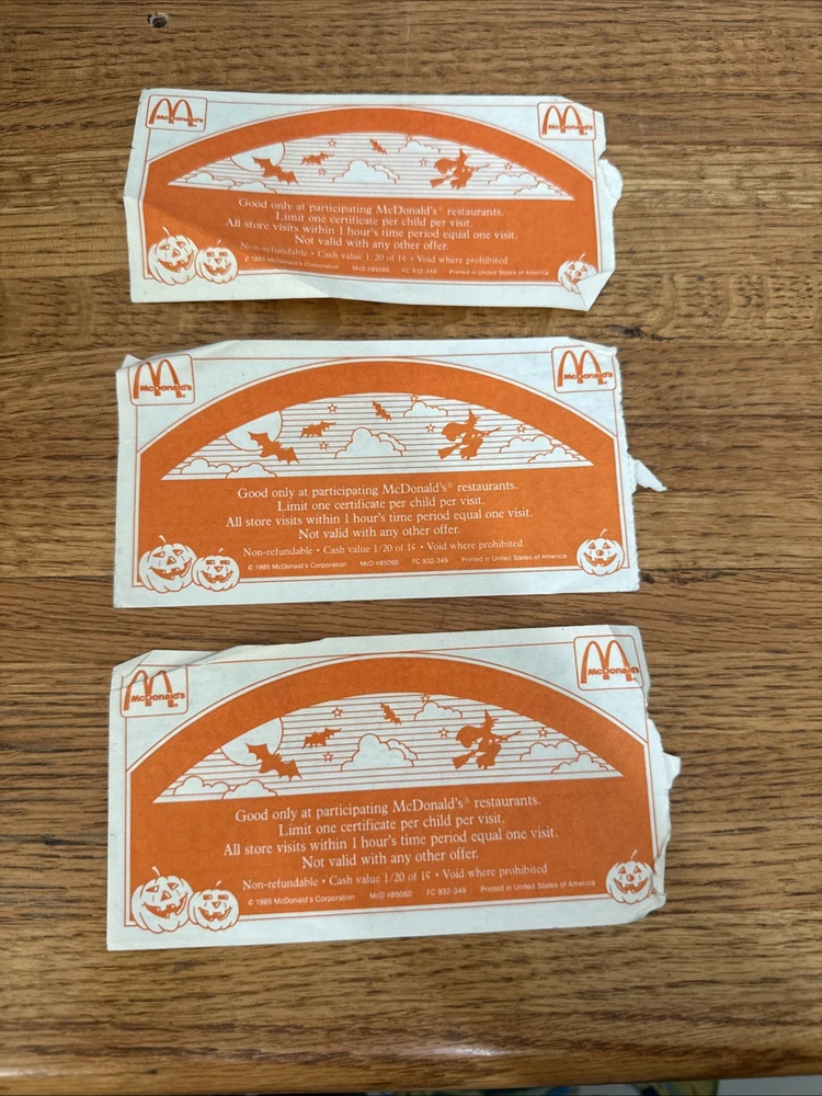 For sale is a Lot Of 3 McDonalds Halloween Gift Certificates Coupon 1985 Vintage. These are used and have folds on them. Some of the corners are rough. Please see all of the pictures for more details. Thanks for looking.