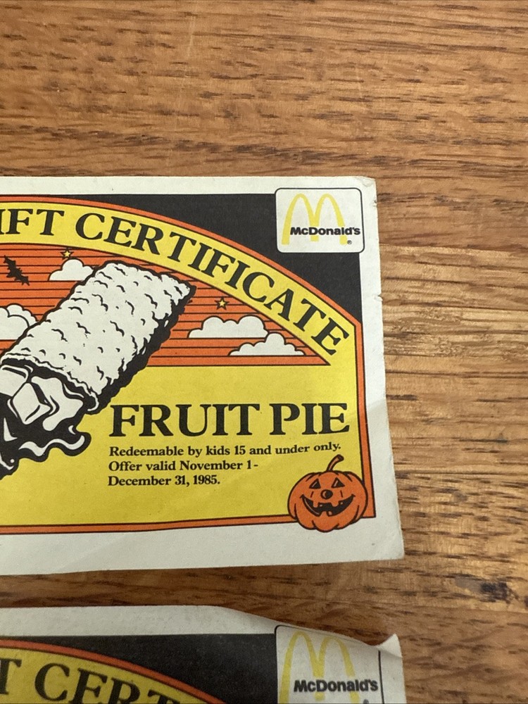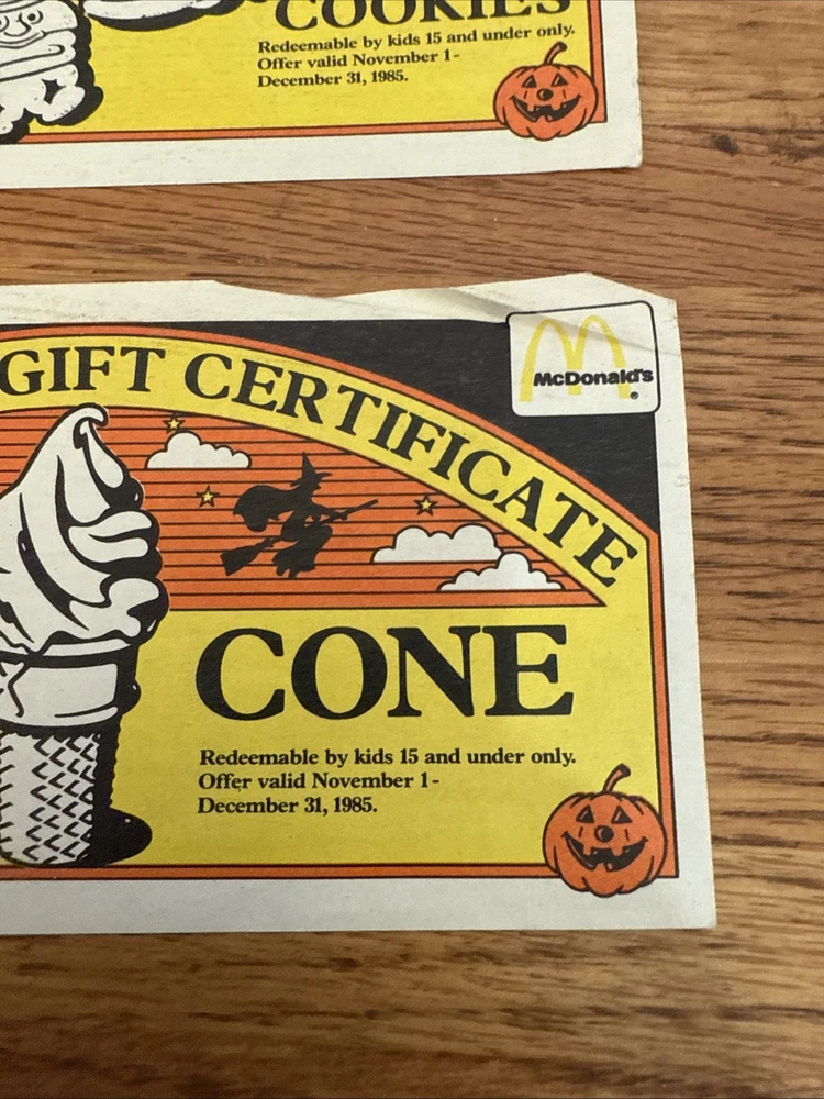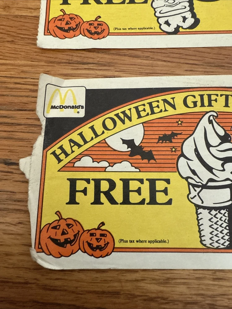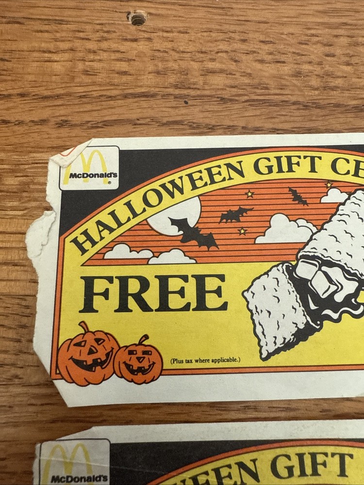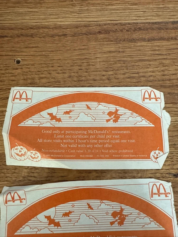 For sale is a Lot Of 3 McDonalds Halloween Gift Certificates Coupon 1985 Vintage. These are used and have folds on them. Some of the corners are rough. Please see all of the pictures for more details. Thanks for looking.