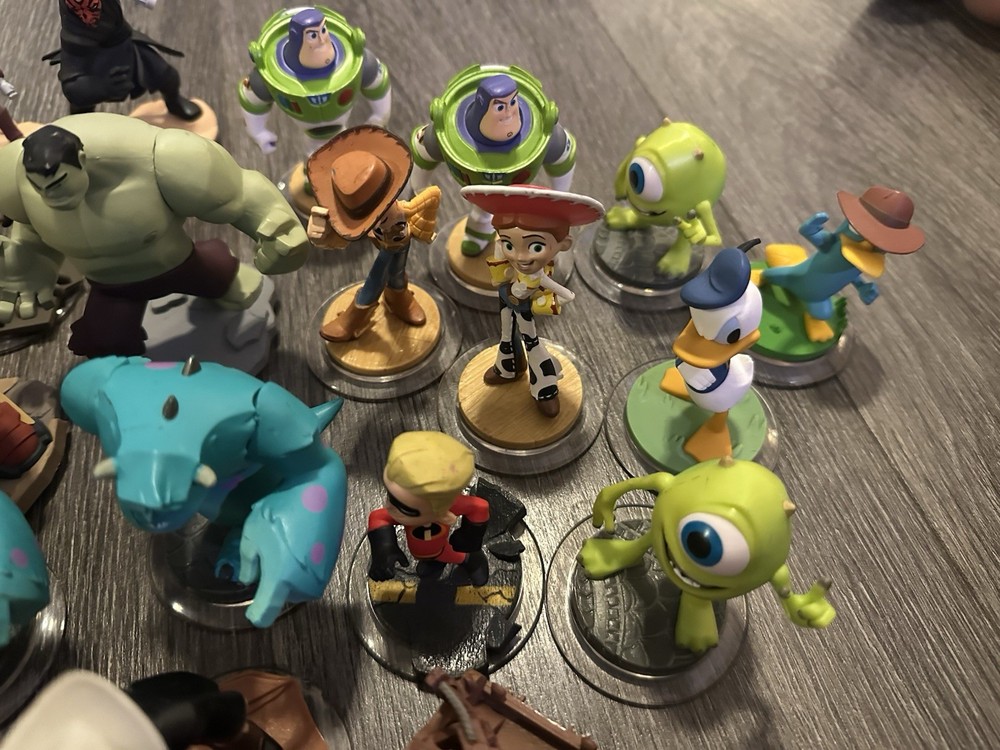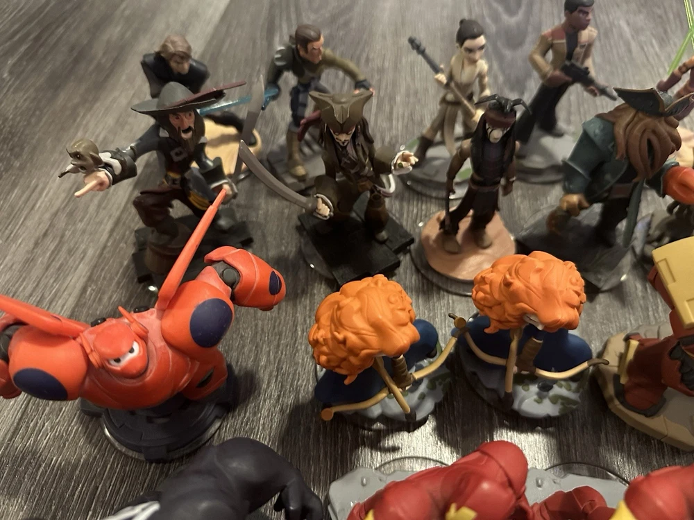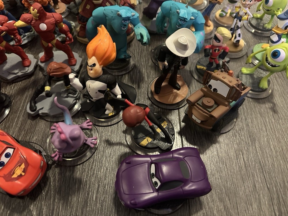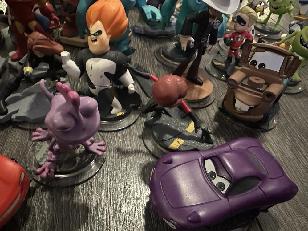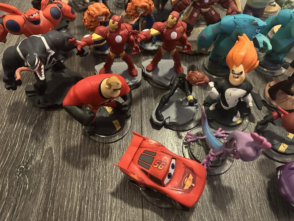 This lot of 39 Disney Infinity figures includes a variety of characters from different universes such as Marvel, Cars, Iron Man, Venom, Toy Story, and Star Wars. Each figure is designed to work with the Disney Infinity video game series and can be used to unlock new levels and special in-game bonuses. The collection features figures from the Disney Infinity product line, which is known for its high-quality designs and attention to detail. Whether you're a fan of the video game series or a collector of Disney-themed toys, this lot of figures is sure to impress.