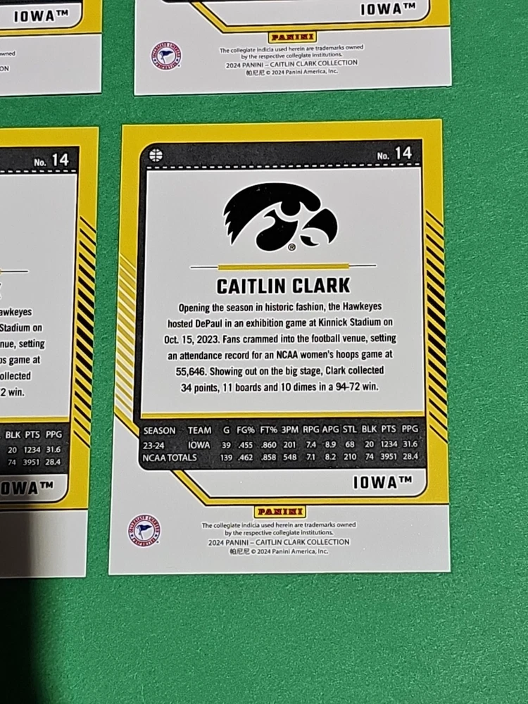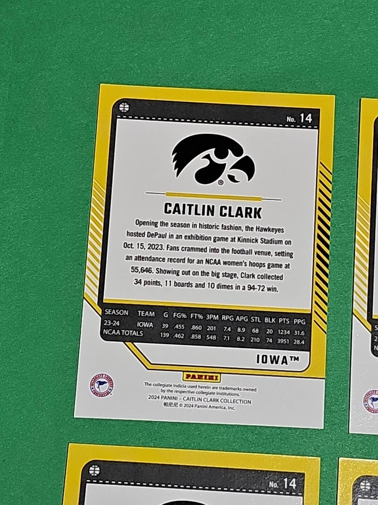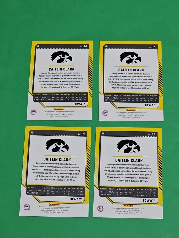 You will receive the exact cards pictured. This Lot of 4 Caitlin Clark Rookie 2024 Panini Donruss Iowa Hawkeyes Card No. 14. Pay only $1.50 for shipping on your first cards won & 50 cents per lot of cards won in auctions up to $5.00. $5.00 is the maximum shipping you will pay, no matter how many cards you win! Please wait until you are done with all your purchases and I will send a combined shipping invoice within 24 hours. Please check out all of my other great auctions going on now! I have several Caitlin Clark Auctions going on now! Thanks for looking & good luck!!