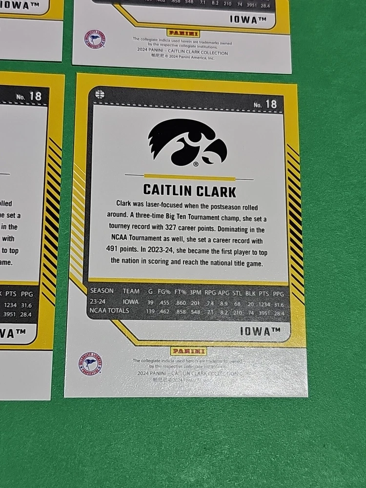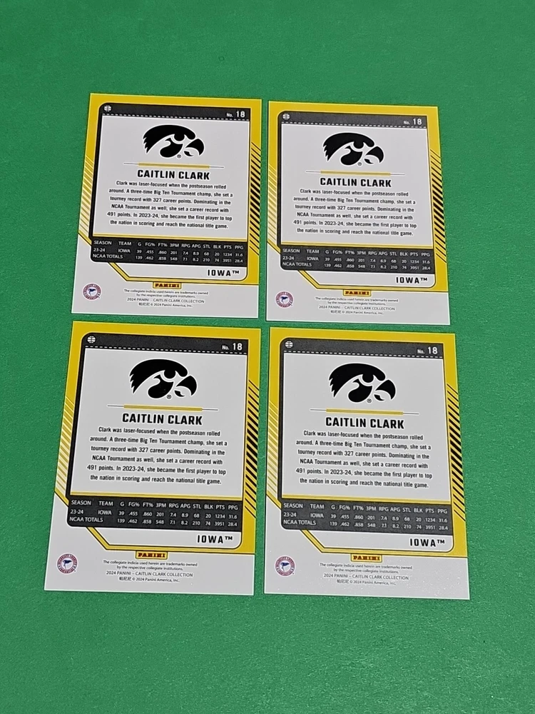 You will receive the exact cards pictured. This Lot of 4 Caitlin Clark Rookie 2024 Panini Donruss Iowa Hawkeyes Card No. 18. Pay only $1.50 for shipping on your first cards won & 50 cents per lot of cards won in auctions up to $5.00. $5.00 is the maximum shipping you will pay, no matter how many cards you win! Please wait until you are done with all your purchases and I will send a combined shipping invoice within 24 hours. Please check out all of my other great auctions going on now! I have several Caitlin Clark Auctions going on now! Thanks for looking & good luck!!