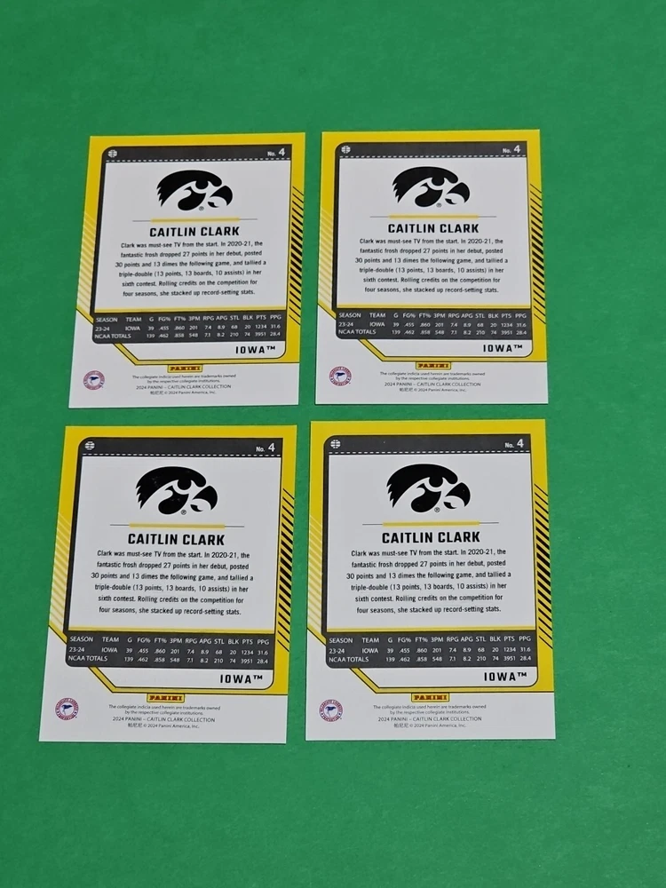 You will receive the exact cards pictured. This Lot of 4 Caitlin Clark Rookie 2024 Panini Donruss Iowa Hawkeyes Card No. 4. Pay only $1.50 for shipping on your first cards won & 50 cents per lot of cards won in auctions up to $5.00. $5.00 is the maximum shipping you will pay, no matter how many cards you win! Please wait until you are done with all your purchases and I will send a combined shipping invoice within 24 hours. Please check out all of my other great auctions going on now! I have several Caitlin Clark Auctions going on now! Thanks for looking & good luck!!