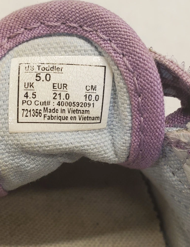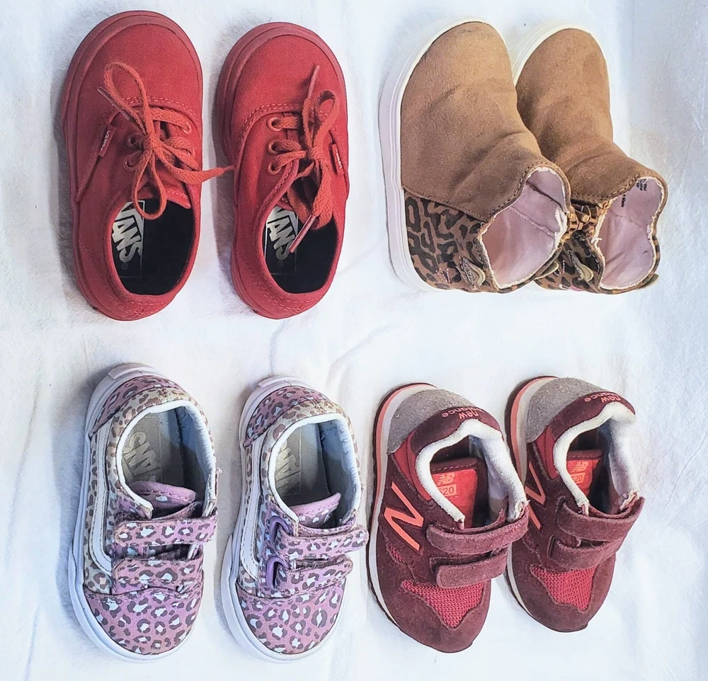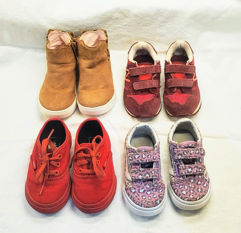 This lot includes 3 pairs of toddler shoes & a pair of boots in size 5 including popular brands as follows: 2 pair of Vans Off The Wall shoes, Self Esteem Boots, and New Balance sneakers. The Vans Off the Wall are a pair of lavender and blue animal print, with hook and loop closure. The other Vans are Off the Wall in solid red with classic red ties. The New Balance are cranberry and gray suede with coral accents, with hook and loop closure. The dessert style boots are tan and animal print zip booties with embroidered cat face on the back, this style is called Kitty Kicks. These are all in gently used condition with little visible wear. Please check all photos, as these shoes have lots of life left! This lot of athletic sneakers are perfect for little ones who want to stay stylish and comfortable.
