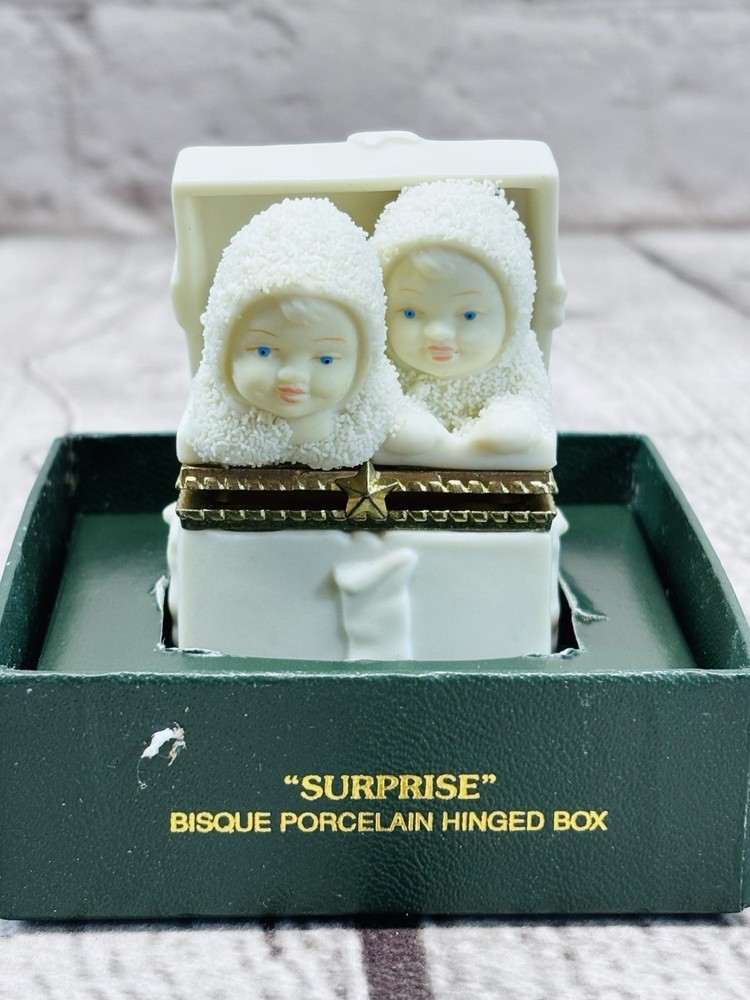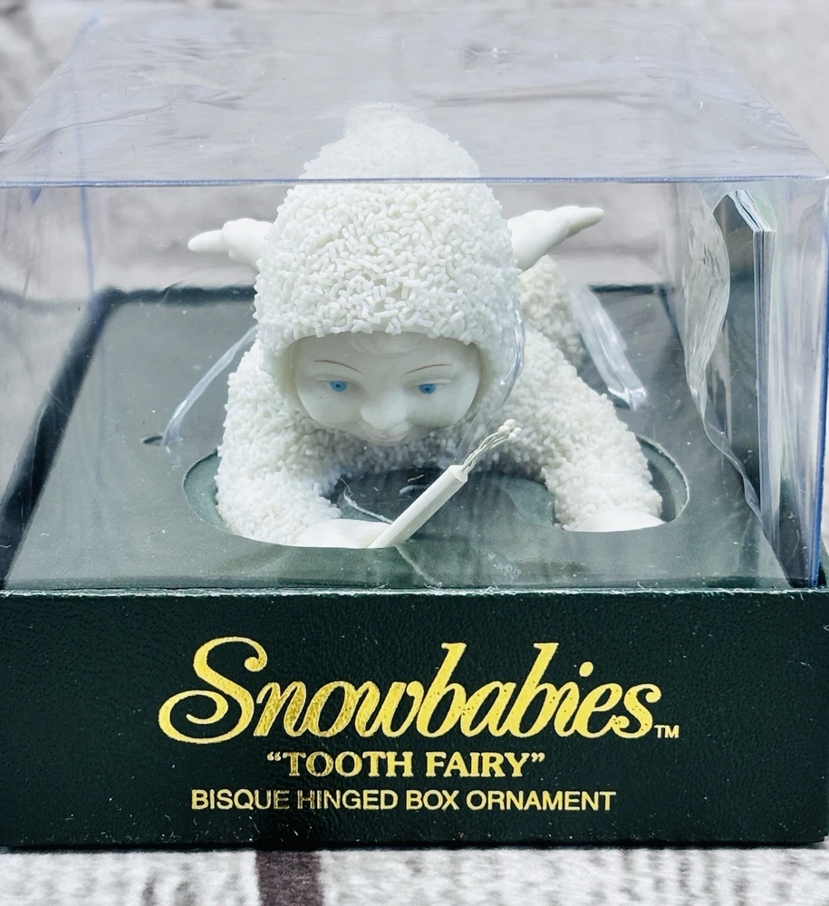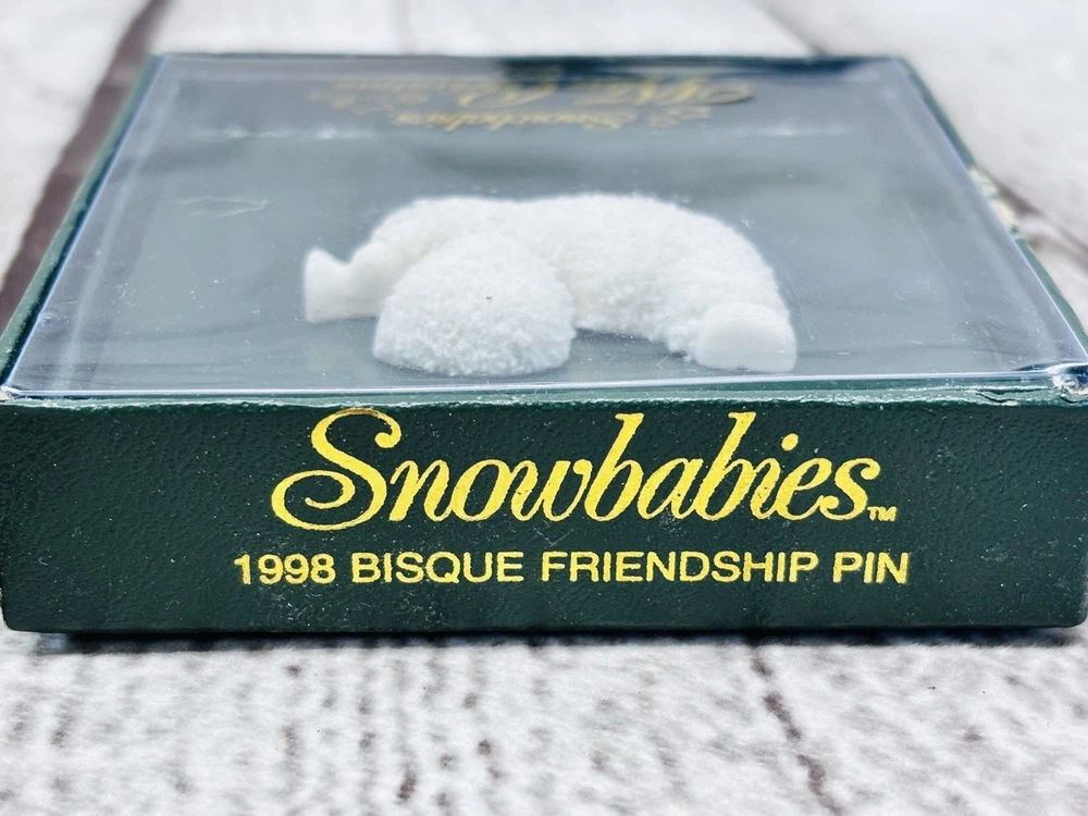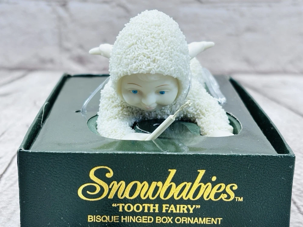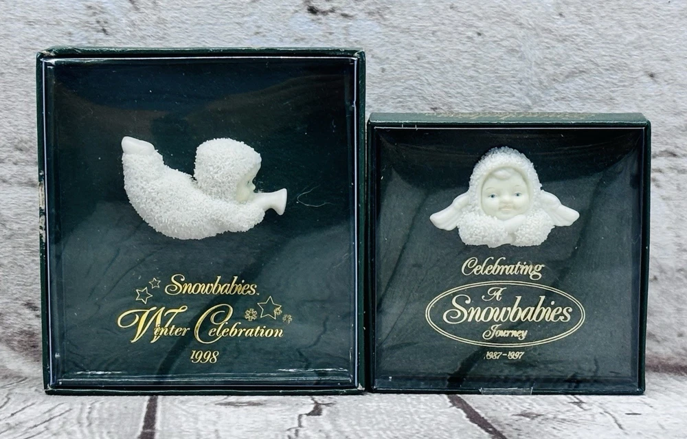 Lot Of 5 Department 56 Snowbabies Hinged Boxes Pins Snow Globe 1997 1998 1999 This lot features five original Department 56 Snowbabies collectibles, all in mint condition with original packaging. Figurines appear never displayed, with pins and hinged boxes still secured in place. Boxes show storage wear but contents remain pristine. •Snowbabies “Surprise” Bisque Porcelain Hinged Box •Snowbabies “Tooth Fairy” Bisque Hinged Box Ornament (tied down, never removed) •Snowbabies 1999 “Reach Out” Snow Globe with original styrofoam packaging •Snowbabies Winter Celebration 1998 Bisque Friendship Pin •Snowbabies Journey Celebration 1987–1997 Bisque Friendship Pin Beautifully detailed bisque porcelain pieces, perfect for collectors or as charming holiday décor. Rare opportunity to find multiple hinged boxes, pins, and a snow globe together in one lot. Ships securely with care.