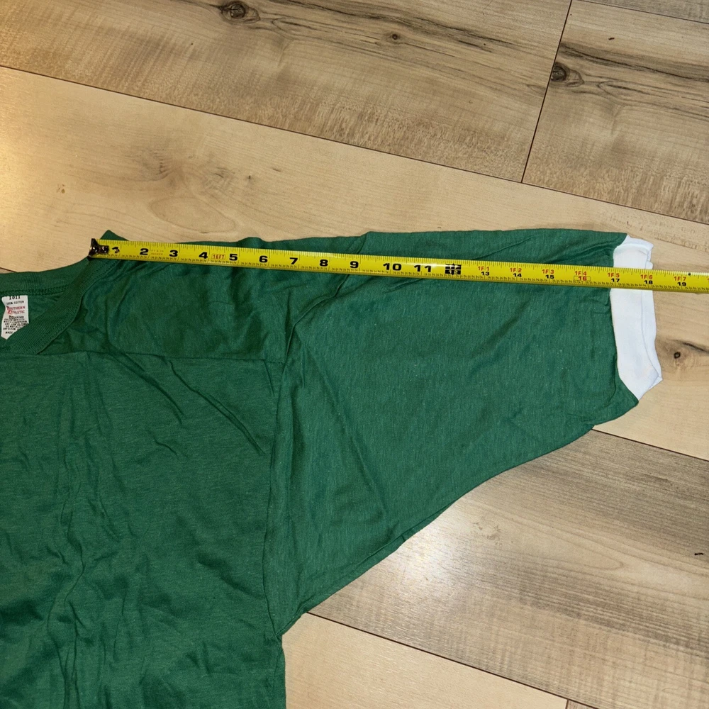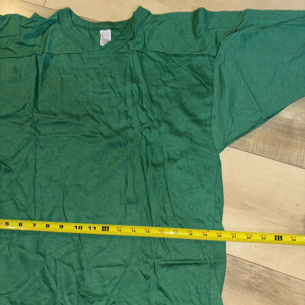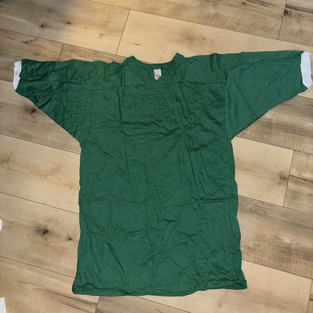 This lot includes five vintage retro quarter sleeve baseball jerseys in size XL. The jerseys come in a beautiful deadstock Kelly green color and are made of high-quality jersey material. Perfect for collectors or anyone looking to add some vintage flair to their wardrobe, these jerseys are a must-have. The material is soft and comfortable, making them great for wearing or displaying. Don't miss out on this opportunity to own a piece of vintage sports history.