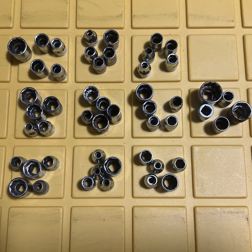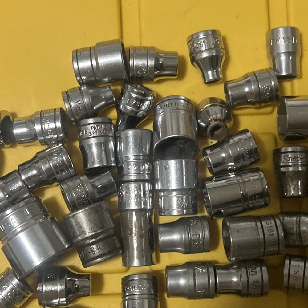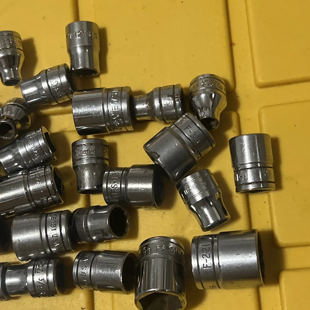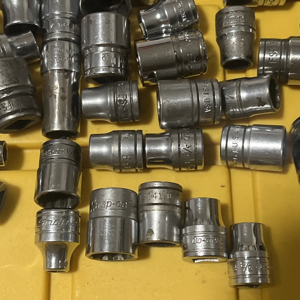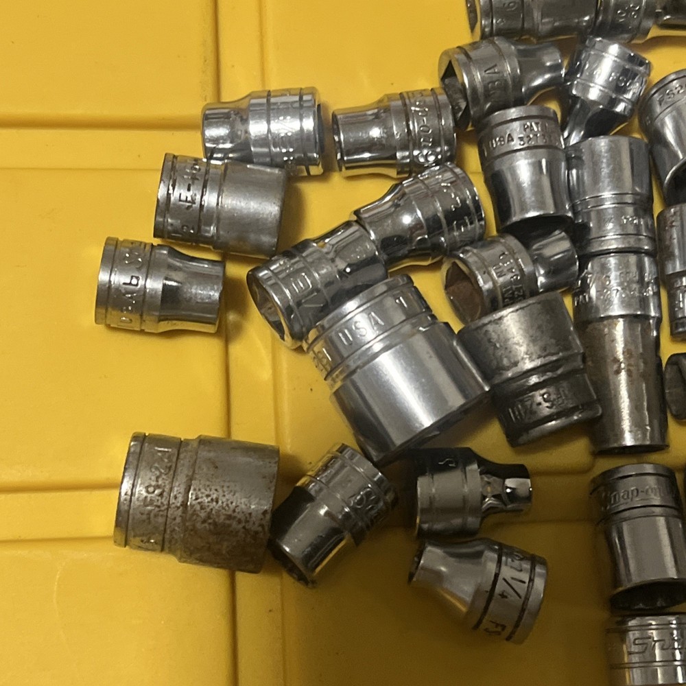 Lot Of 50 Snap On shallow sockets 3/8” Dr All 50 tools are snap-on sockets are SAE/standard Thats $4 each Sold as is Some Items contain rust, owner markings, normal wear or peeling as items are pre-owned. Questions? Please ask before purchase Please check my other listings Keywords: snap on tools, snap-on, snapon 3/8” drive sockets, snapon, snapon sockets lot, snapon tools lot. Lot Z