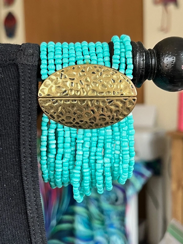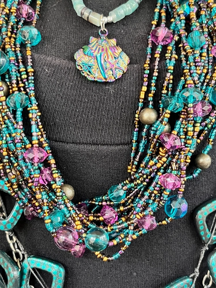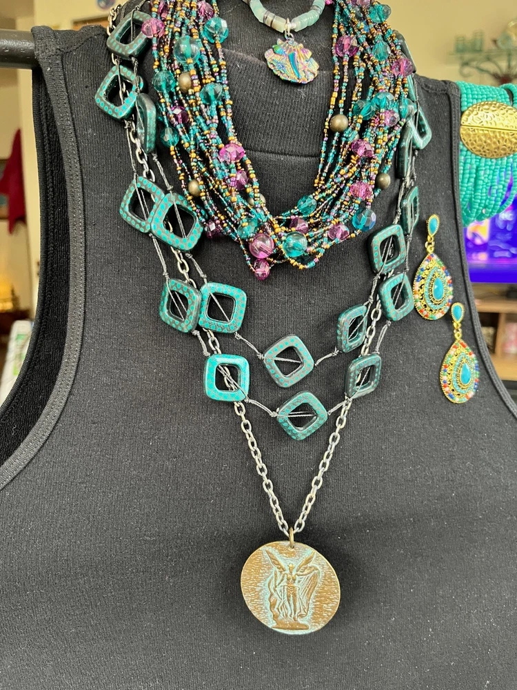 This lot includes 4 gorgeous necklaces, 1 pr earrings, and a 13 strand bracelet in shades of teal blues. The photos barely show the teal shaded background of fairy reversible amulet. The vintage-inspired pieces feature a mix of materials like shell, glass, plastic, acrylic, and crystal, with a beachy, bohemian, and ethnic theme. The set is reversible and includes a pendant, perfect for adding a touch of glam to any outfit. If you choose to auto-pay beyond one week, please contact me ahead of time. Please check your eBay messages for updates 💕 *Any wear, oxidation or discoloration (for example near/on clasps) is comparable with the age and pre-loved nature of the pieces I list. **Items may need a gentle wipe down. ***I price fairly based on market comparables when available. ****Please pay promptly. I hold for 2 days unless otherwise arranged, but not beyond 1 week. If paying with Auto Pay, please eBay message me if u need more than 1 week out. *****I'd like this experience to be fun. 💕Good luck! Live Generously 💕