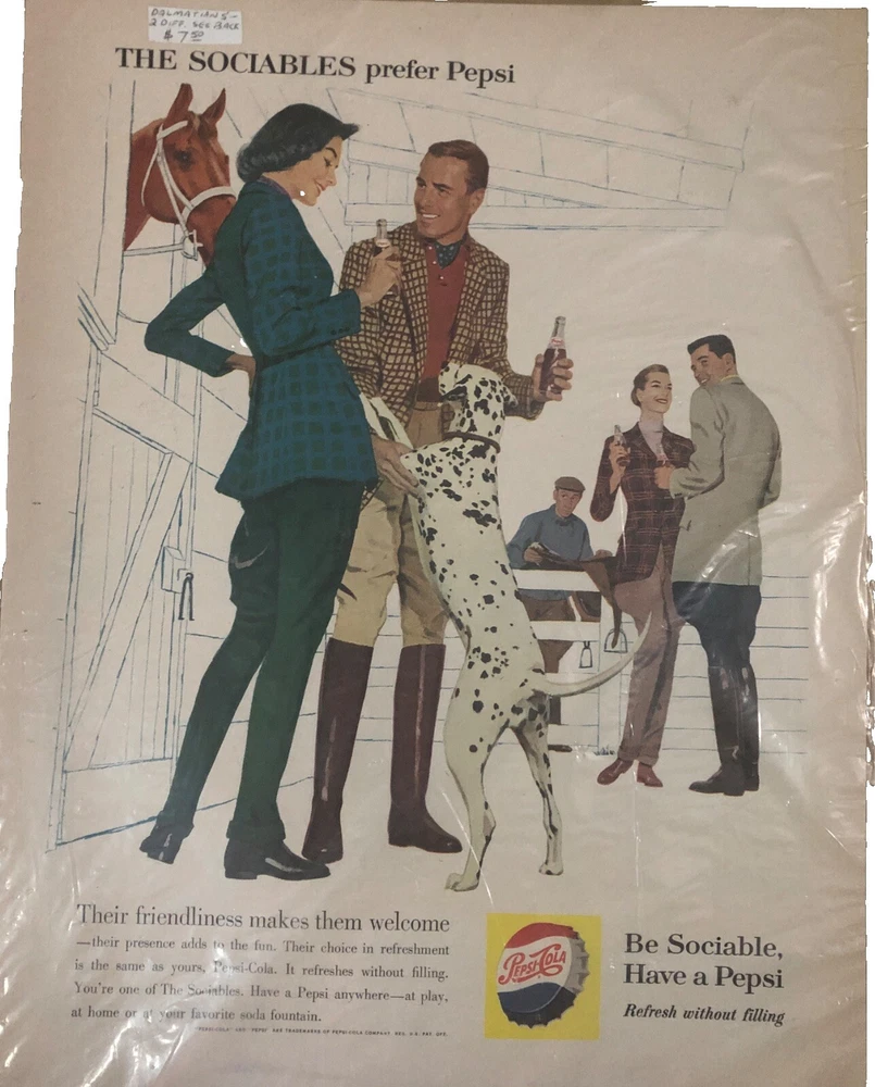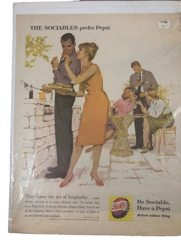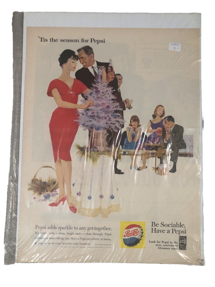 Explore a vintage collection with this lot of 6 original Pepsi-Cola print ads from the 1950s. These authentic advertisements showcase the classic branding and vibrant illustrations that have made Pepsi a household name for generations. Each piece offers a unique glimpse into the past, featuring the iconic Pepsi logo and script in a multi-colored palette that captures the essence of the era. Ideal for collectors and enthusiasts of retro Americana, these ads are an original production, not reproductions, ensuring you own a true piece of Pepsi history. The Sociables series encapsulates the soda theme with timeless appeal, making it a standout addition to any advertising collection or a nostalgic decor enhancement for your home or office.