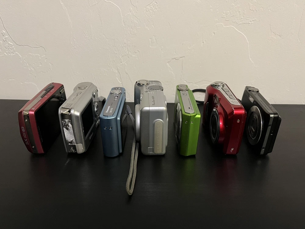 Lot Of 7 Digital Cameras: Canon, Nikon, Kodak, Lumix, & Casio - ALL SHOULD WORK! 3 of the cameras that take AA batteries have been tested recently and work well. Of the other 4, 2 have batteries, 2 don't. The other 4 have not been tested in a while but worked perfectly fine last time they were used. I would be very surprised if the other cameras and if multiple of them end up having issues I would be happy to accept a return. The Canon camera comes with some cords a camera bag and some manuals. Camera condition varies. See photos for condition. Feel free to message me with any questions!