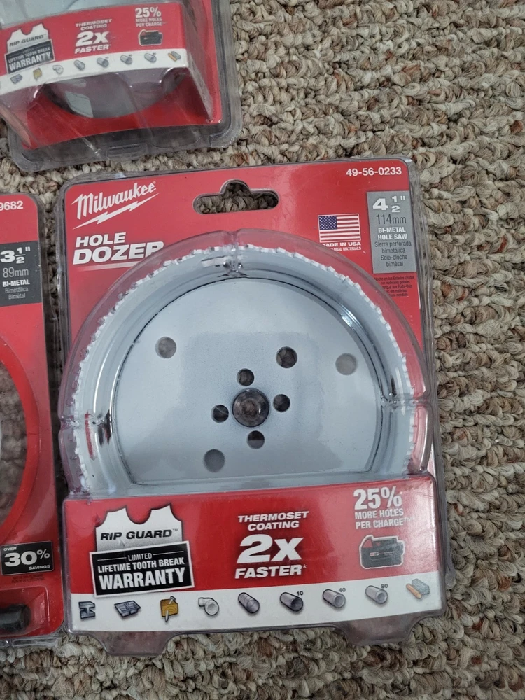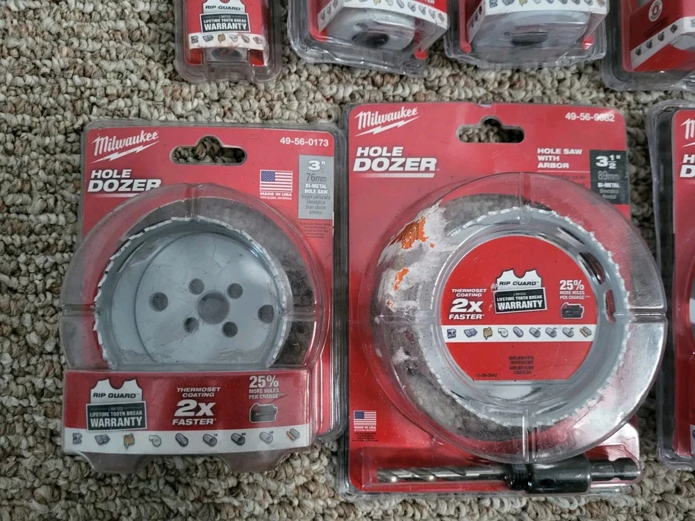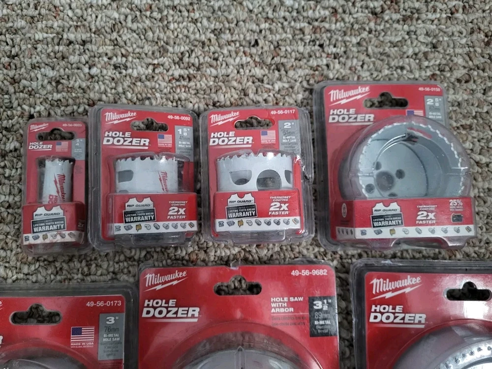 ¾" 1⅝" 2" 2⅝" 3" 3½" 4½" 7 total with 1 arbor. This lot includes 7 Milwaukee Hole Dozer Bi-Metal Hole Saws in white color, with different sizes. The multi-material saws are suitable for drilling and come with 1 arbor for convenience. Made in the United States by Milwaukee, this set offers a variety of hole saw sizes for different drilling needs, making it a versatile addition to any toolbox.