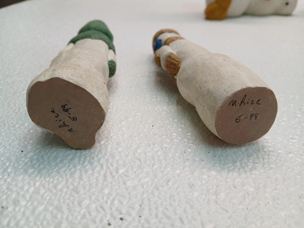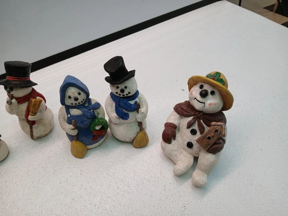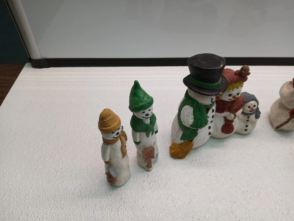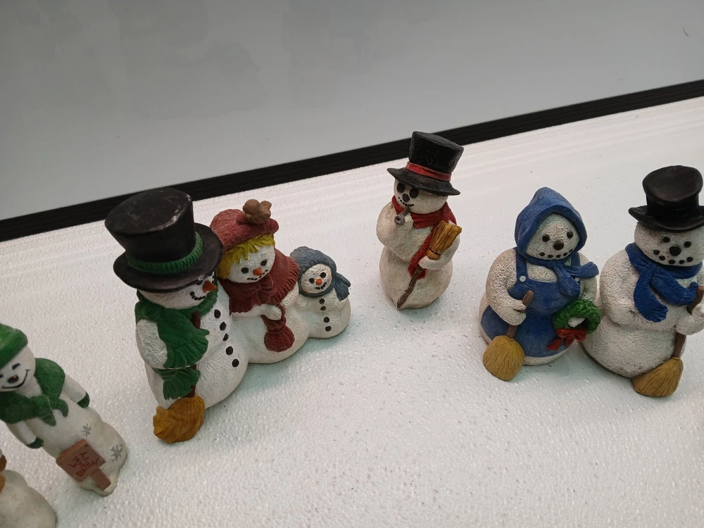 This lot includes 7 hand-painted snowmen and women figurines from the 1998 M. Rice Collection. The figurines feature a multicolor design, made of resin, with a fantasy theme suitable for Christmas. They were manufactured in the United States during the 1990s and have a painted finish.