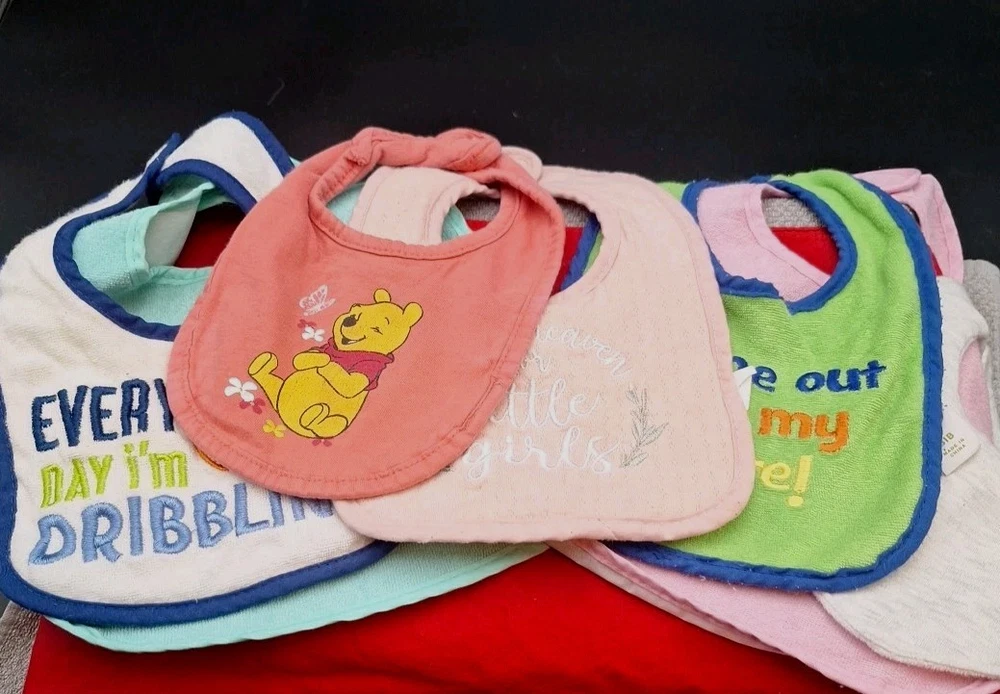This bundle includes 8 baby-toddler bibs for boys and girls, featuring fun sayings themed for mealtime. Made of cotton with a holiday theme, these drool bibs have convenient velcro closure and snap closure for easy use. Personalization is not available, but the bibs are designed with a festive spirit for celebrations.