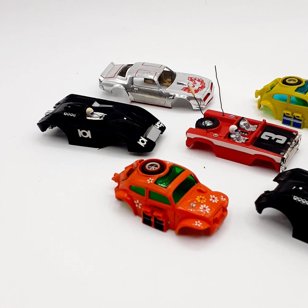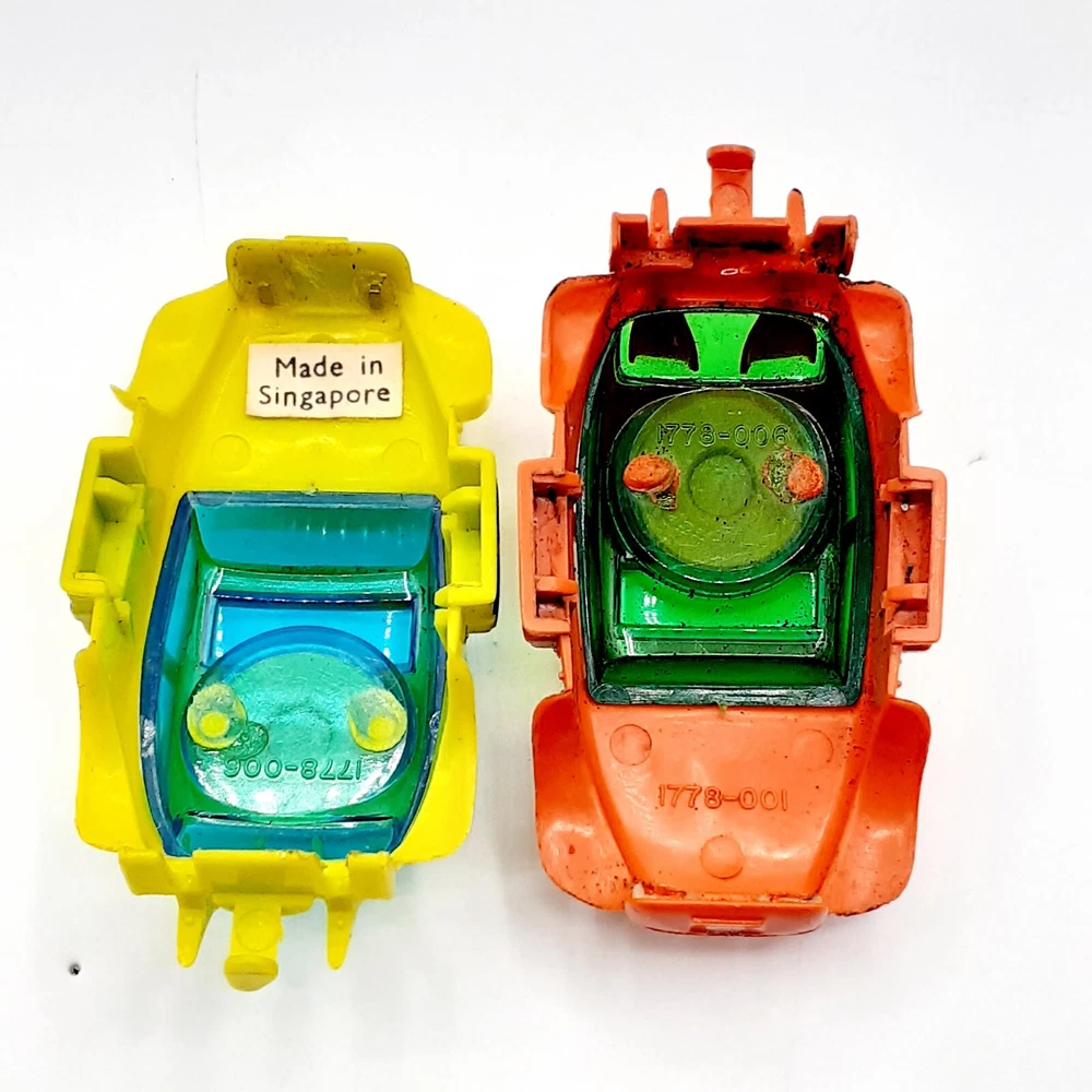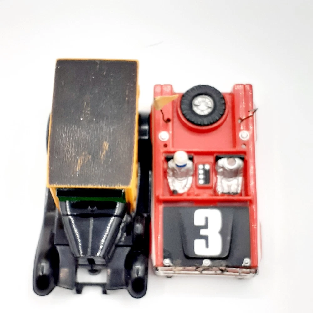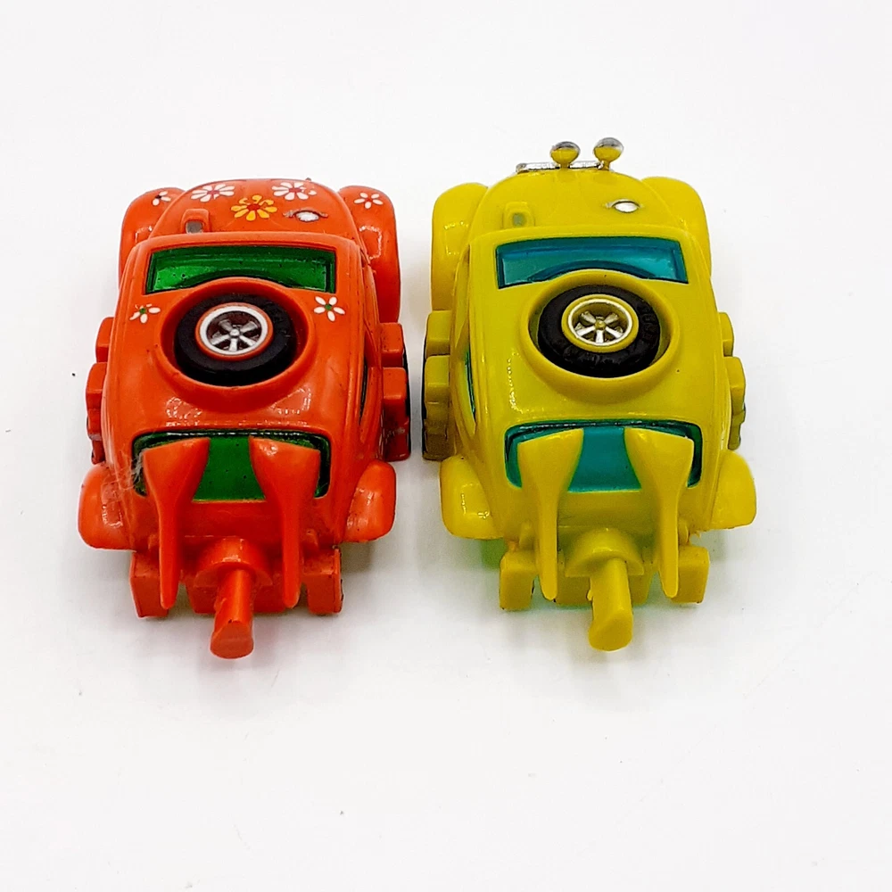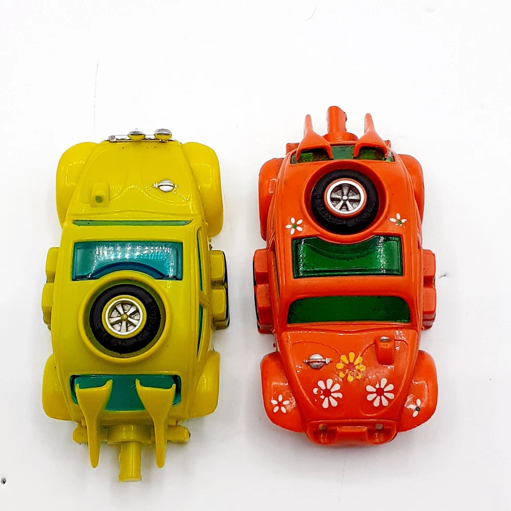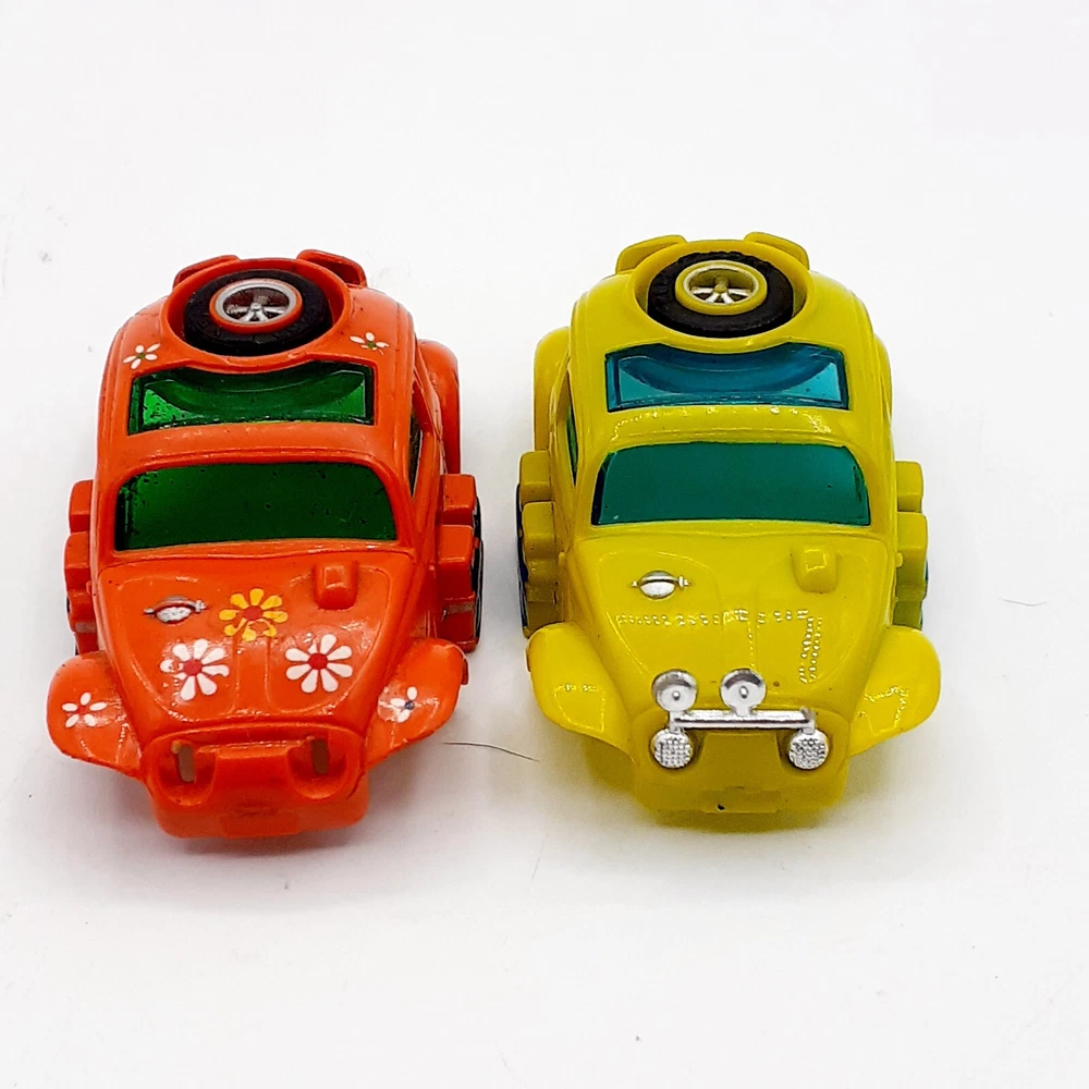 One of the Volkswagen beetle is missing the front bumper assy. The other Volkswagen beetle is missing the left headlamp. One of the black race cars' front post is split but still takes & holds a screw. Please view the photos for the best condition description. I do combine shipping and thanks for visiting my store, I certainly appreciate ya!! 👽🦩🛸