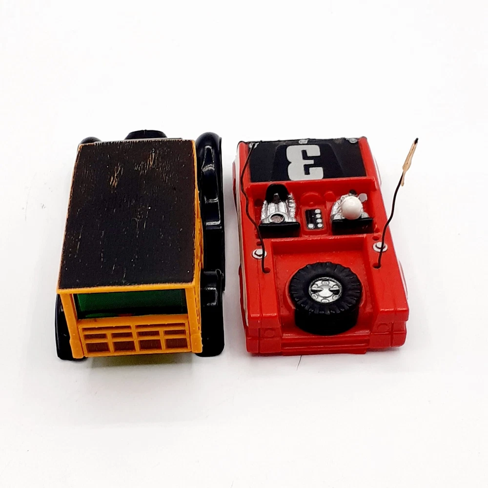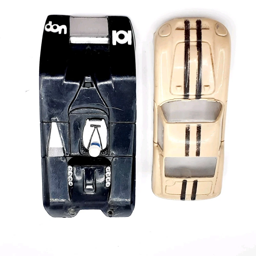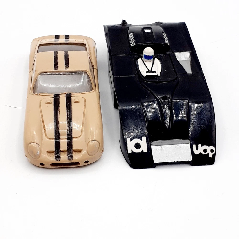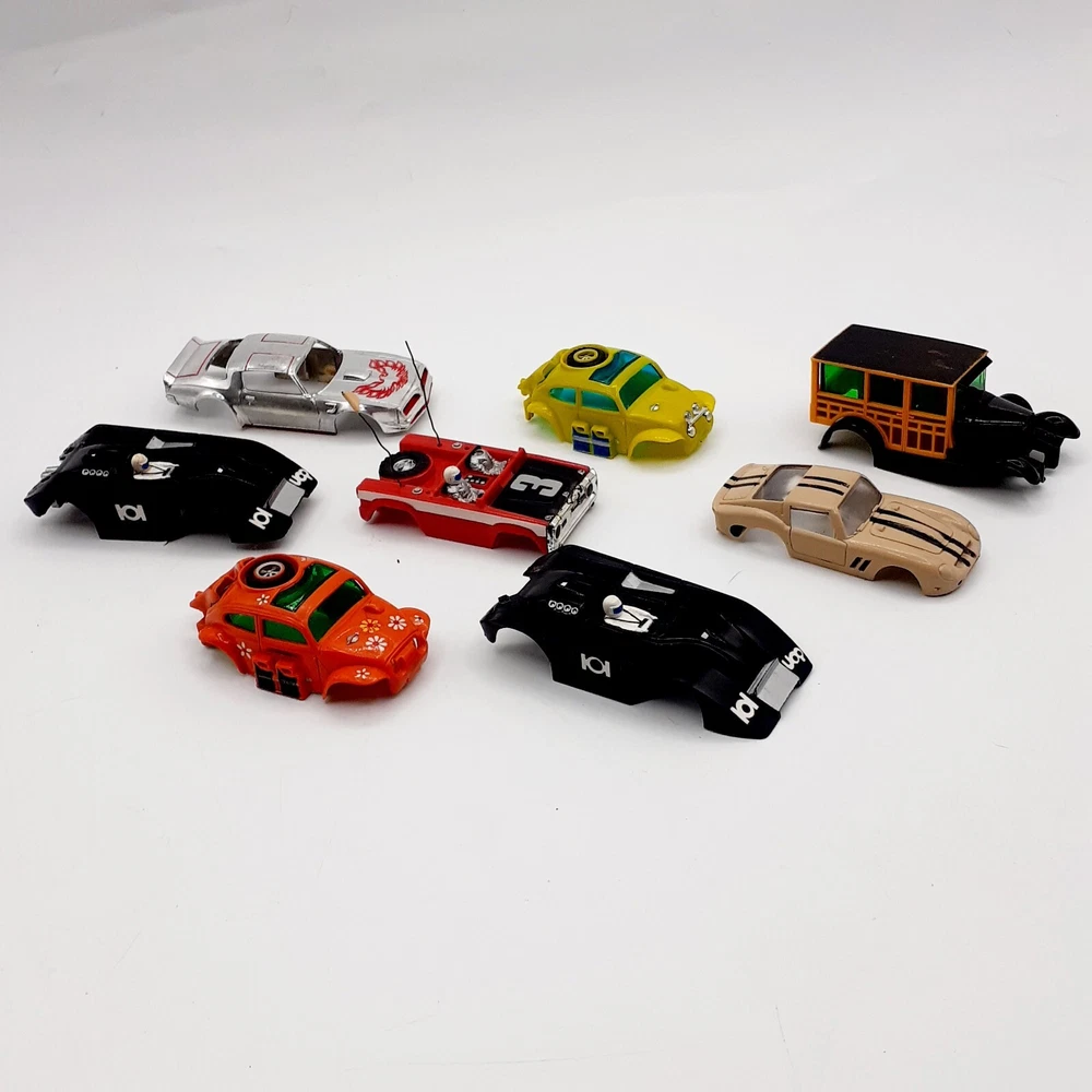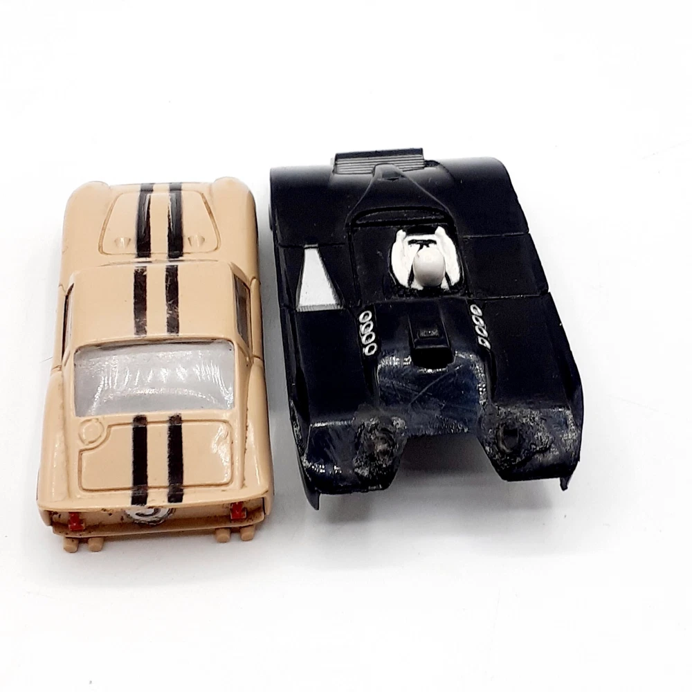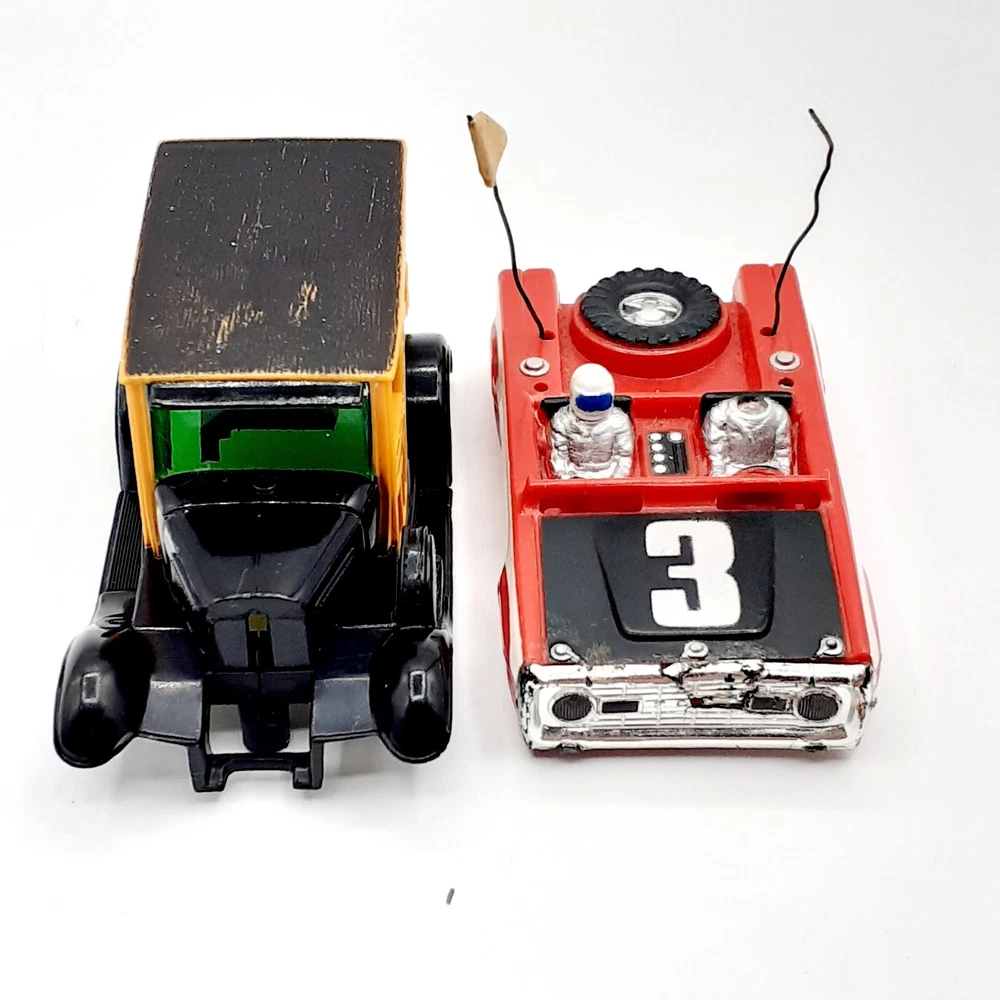 One of the Volkswagen beetle is missing the front bumper assy. The other Volkswagen beetle is missing the left headlamp. One of the black race cars' front post is split but still takes & holds a screw. Please view the photos for the best condition description. I do combine shipping and thanks for visiting my store, I certainly appreciate ya!! 👽🦩🛸