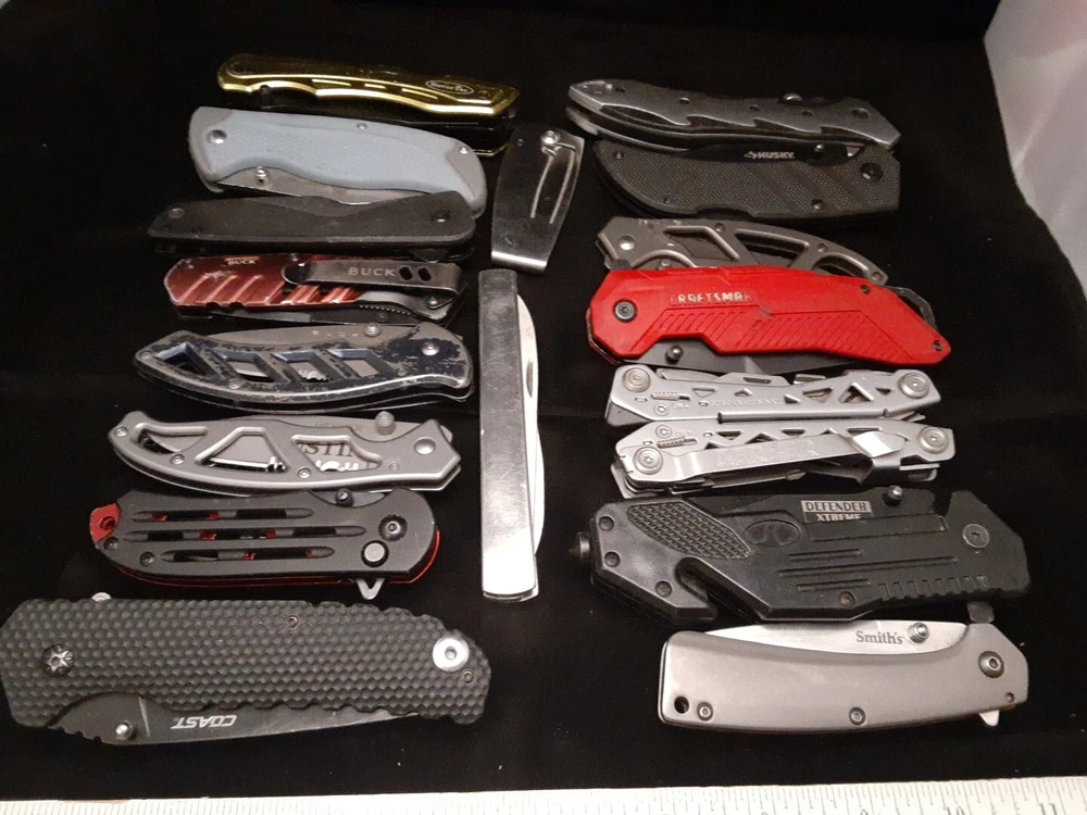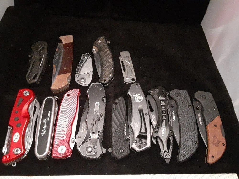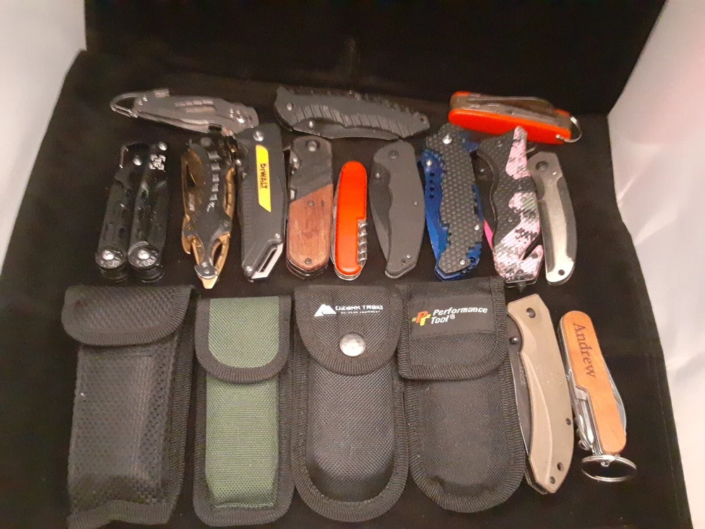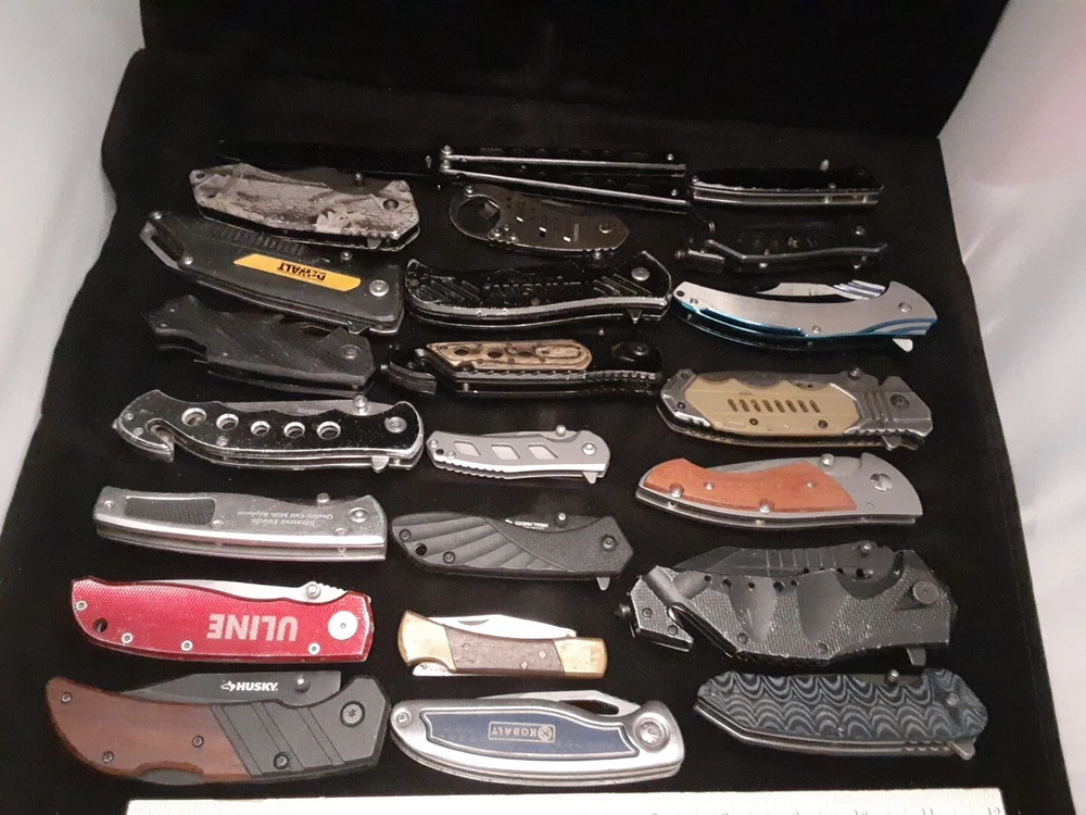 Knives and tools are in various condition. Blades, tools and scales show signs of use such as scratches, dings, dents, loss of color, chipping and marring. Most if not all are in working condition. No guarantee of quality or condition. Please see all pictures and use zoom function to see all Items. Items May Need To Be Cleaned Further. Blades May Need To Be Sharpened.