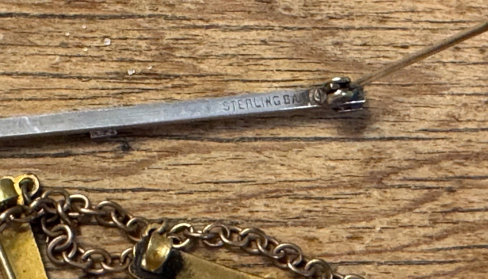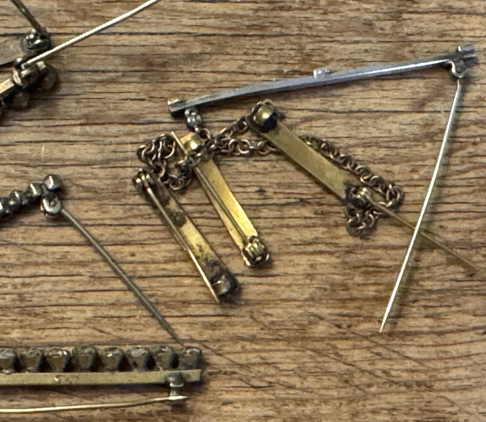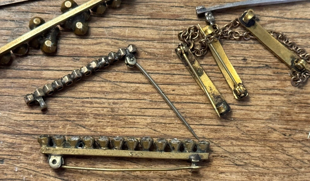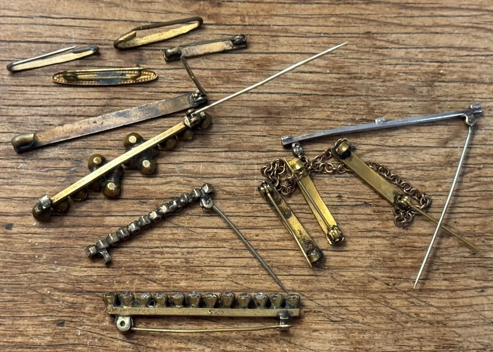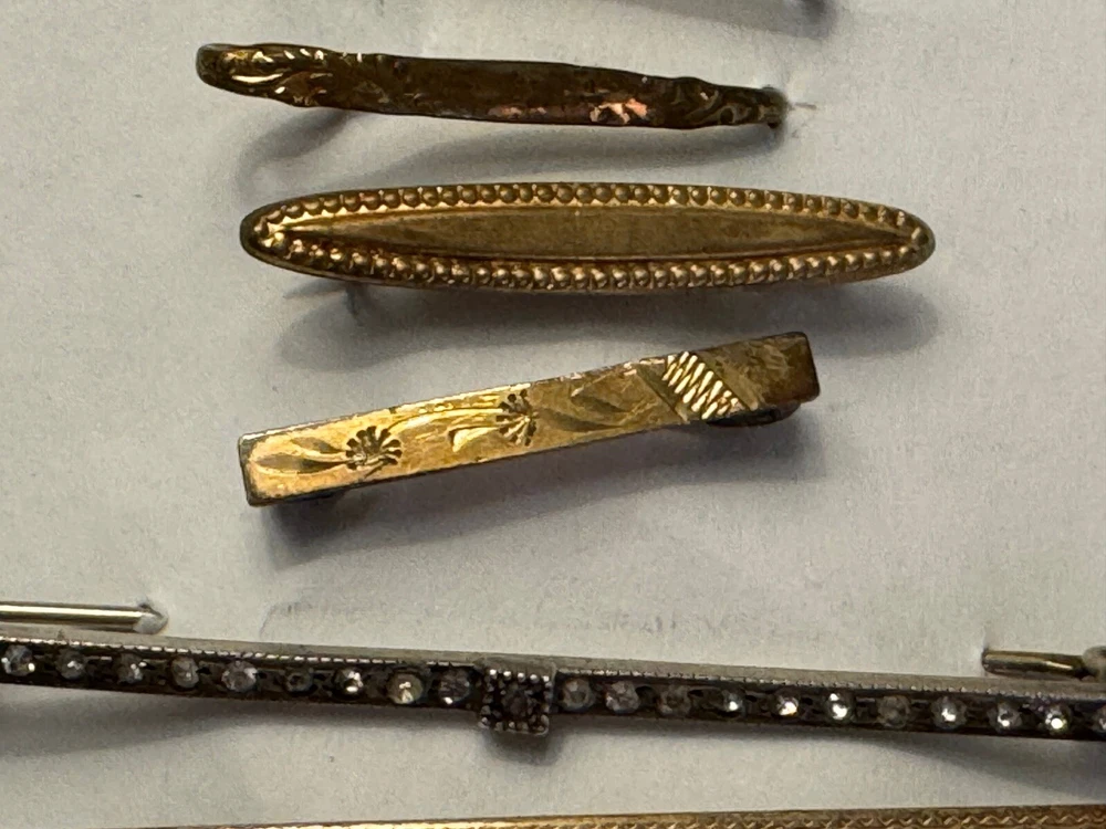 Lot of ten ladies lingerie or bar pins from the Edwardian & Art Deco eras. Eight have open or safety pin style clasps with the exception of the sterling silver bar pin which has a roll over clasp. There are three pins with clear rhinestones, and the rest have scrolled designs-flowers, lines or similar designs. The clasp on the sterling & rhinestone bar pin needs repaired. There is a three pin set, attached by gold filled chain. This is a nice collection for someone collecting jewelry of this age. Email with questions.