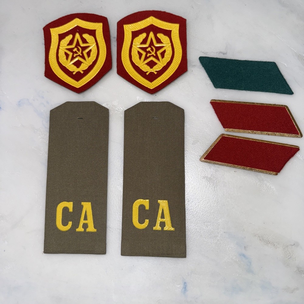 Mixed lot of Soviet / Russian military uniform insignia and shoulder board pieces. Includes shoulder board backings, fabric collar tabs, and an embroidered Soviet red star patch. Items appear to be surplus or reproduction and are sold as-is. Great for collectors, reenactors, or display. Includes (as pictured): • 1 Soviet-style green slip-on shoulder board • 1 olive hexagonal sleeve or shoulder patch backing • 1 embroidered red & gold Soviet star patch • 1 gold-tone shoulder board backing plate with red cloth • 1 red fabric tab • 1 green fabric tab Condition • Pre-owned • Some items show light wear from age/storage • Sold as a mixed lot Perfect for anyone collecting Soviet military memorabilia or creating displays, reenactments, or costume builds.