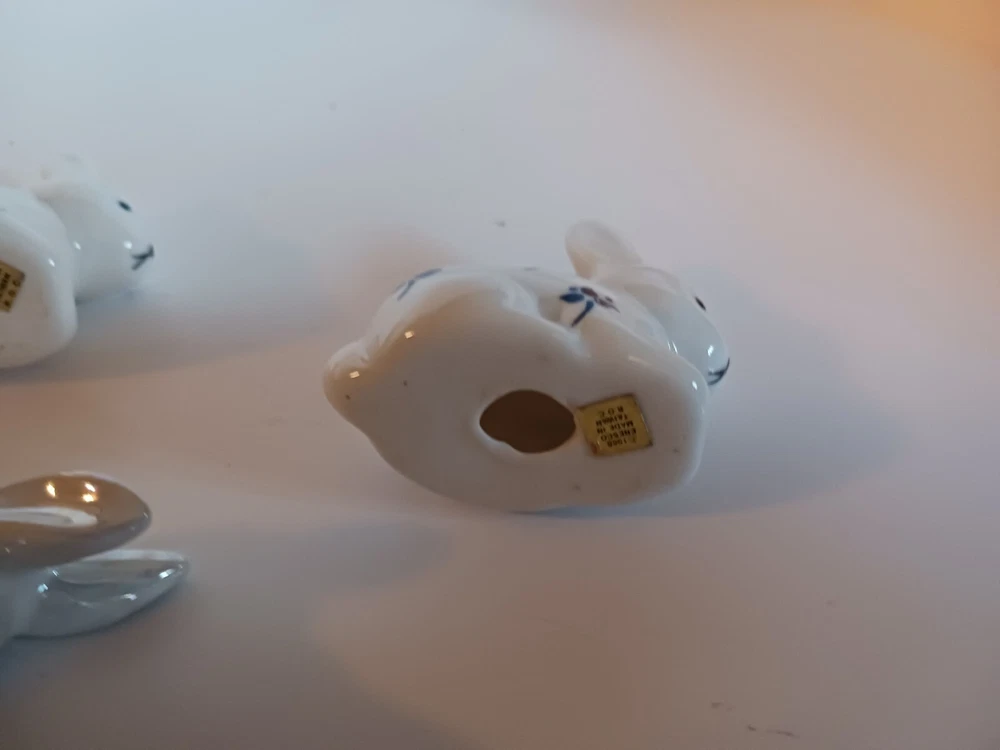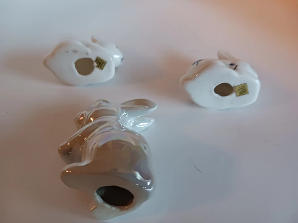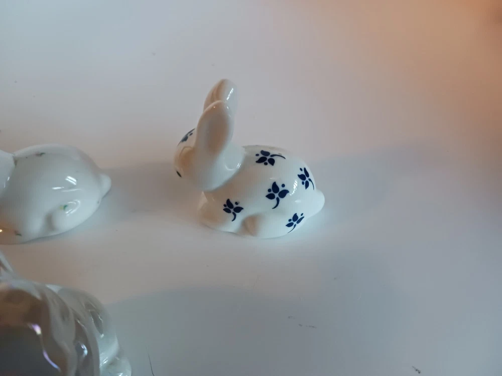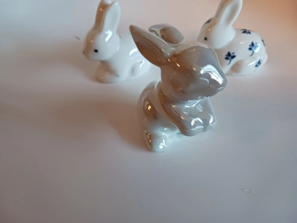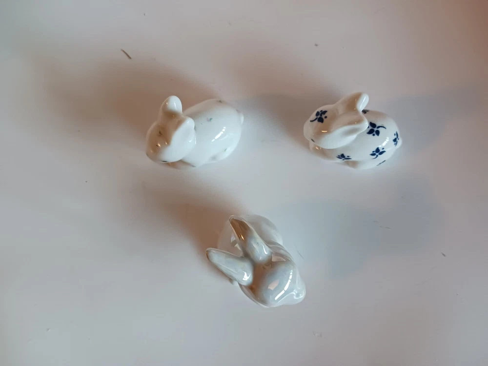 This lot consists of three small porcelain figurines of rabbits or bunnies. These collectibles are perfect for any fan of farm and countryside themes, and would make a great addition to any animal figurine collection. Crafted with care, these figurines are sure to please any lover of rabbits and add a touch of charm to any home decor. Range from 2 to 2.5 inches.
