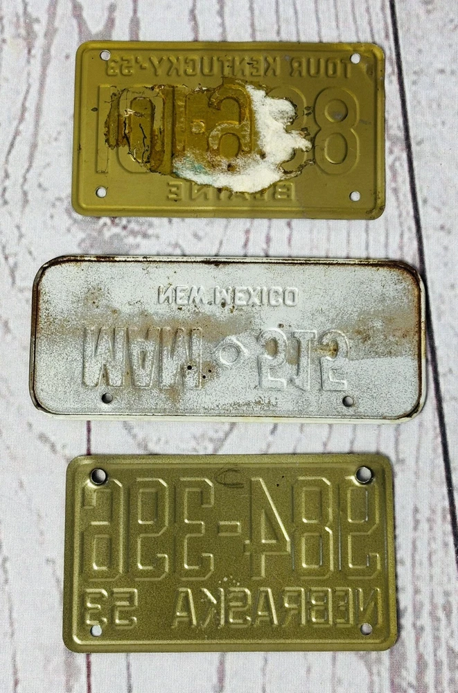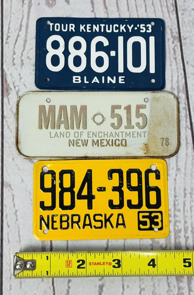 Add a touch of vintage charm to your collection with this lot of three classic motorcycle and bicycle license plates, hailing from the dynamic decades of the 1950s and 1970s. Each piece is a genuine artifact from the United States, reflecting a rich history of automotive culture and personal transportation. Ideal for enthusiasts of Americana or collectors seeking to expand their repertoire of historical memorabilia, these license plates capture the essence of bygone eras. Display them with pride or gift them to a fellow collector; they're sure to be a conversation starter at any gathering.