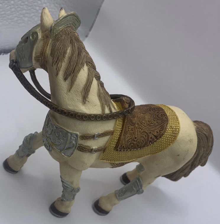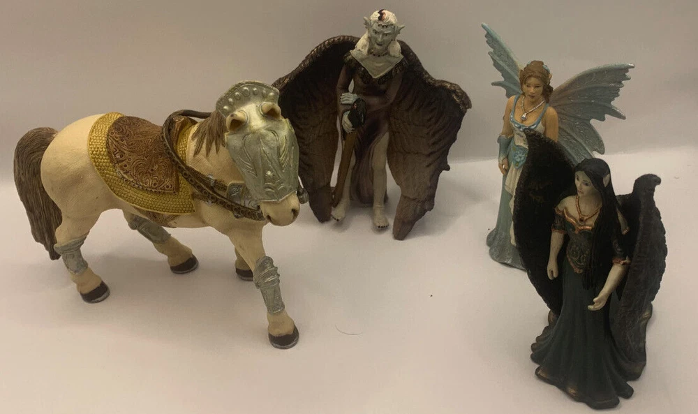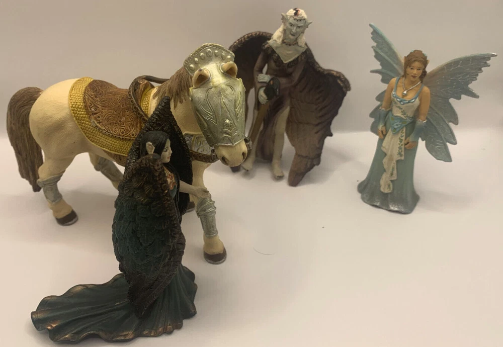 Lot of three Schleich World of Elves Figures and one armored horse. I think the horse normally goes to a Knight. The fairies have some paint wear and play wear. They as well have dust and there is a little silvery paint on the bottom of the skirt of the feathery winged black haired Fairy. Horse has some paint rubbed on it from something else. Nonsmoking home but we have pets.