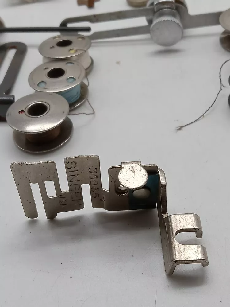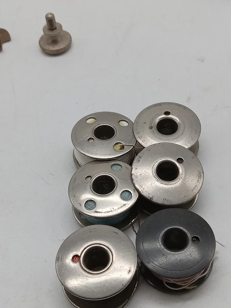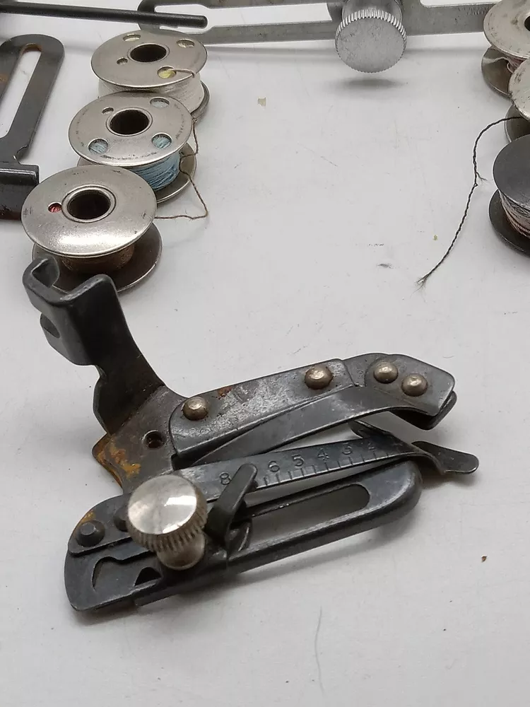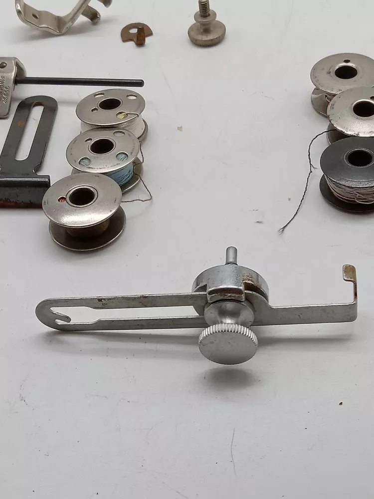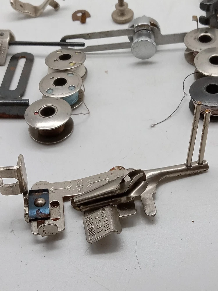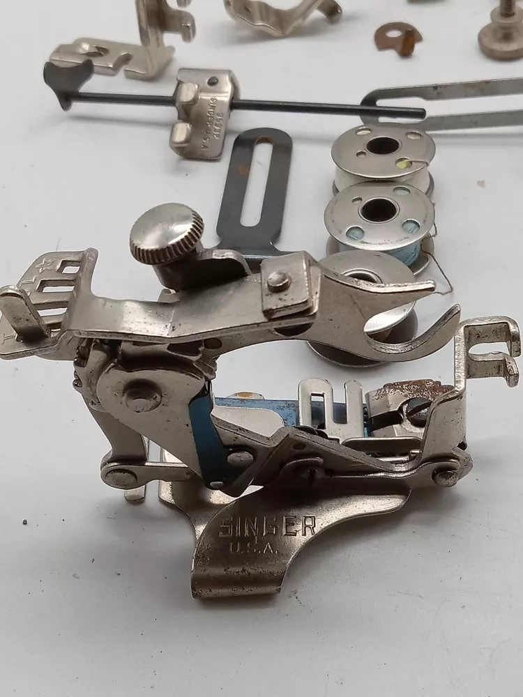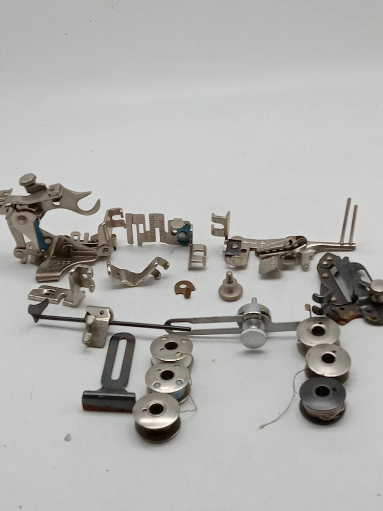 The product is a lot of Singer sewing machine attachments and accessories, specifically metal bobbins. These accessories are compatible with Singer sewing machines and are made in the United States. The lot includes various attachments and accessories designed for Singer machines, offering versatility and convenience for sewing projects.