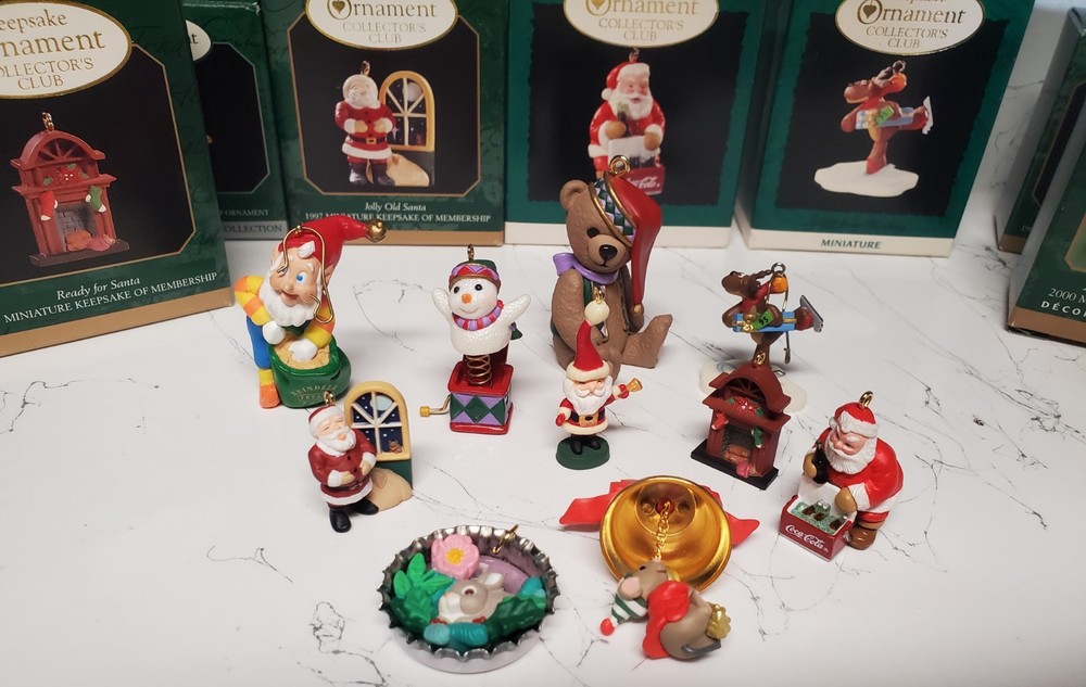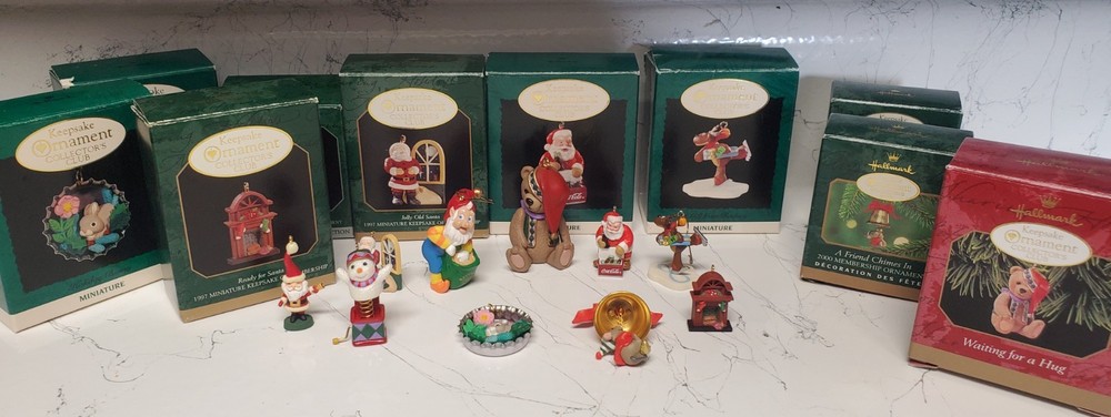 This listing is for a rare collection of 10 vintage Hallmark Keepsake Miniature Ornaments, mostly from the Collector's Club series, dating from 1993 to 2000. These highly-detailed ornaments come in their original boxes. Condition Details: All ornaments are in good, pre-owned condition with minimal signs of wear. They have been stored in their original boxes. Boxes show normal shelf wear consistent with age (please refer to photos for exact condition). Included Ornaments: 1993 "Cool Santa" (Coca-Cola Themed) 1994 "Holiday Bunny" 1995 "A Gift From Rodney" (Reindeer) 1996 "Rudolph's Helper" (Elf with Treats) 1997 "Jolly Old Santa" 1997 "Ready for Santa" (Mouse by Fireplace) 1998 "Kringle Bells" 1999 "Waiting for a Hug" (Bear) 1999 "Snowy Surprise" (Snowman Jack-in-the-Box) 2000 "A Friend Chimes In" (Mouse in Bell) Why Buy This Lot? Selling as a convenient lot for a collector to quickly expand their KOC collection or for starting a new miniature tree display. The variety of characters and years makes this a unique find!