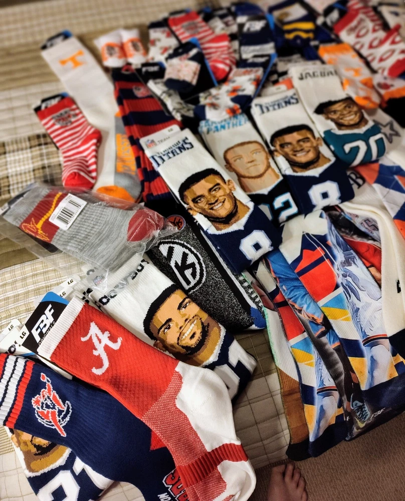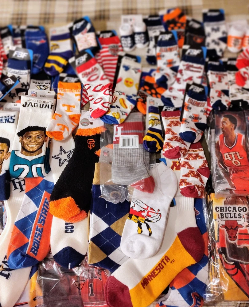 The product is a bulk wholesale lot of 100 socks from adult sizes through infant sizes featuring sports themes from MLB, NFL, NBA and NCAA. The socks are suitable for everyday wear and come in a variety of multi-color designs. They are available in regular sizes for both adults and infants, making them perfect for resale or consignment purposes in various seasons throughout the year. This lot has a retail value well over $500 dollars and would make a great deal for someone doing flea markets or consignment type selling. Please feel free to ask any questions before purchasing and thanks for looking S1
