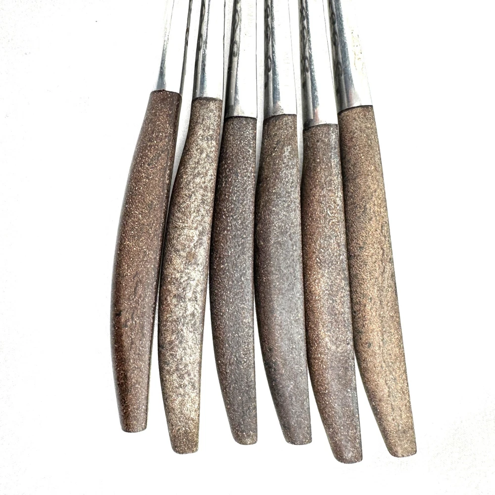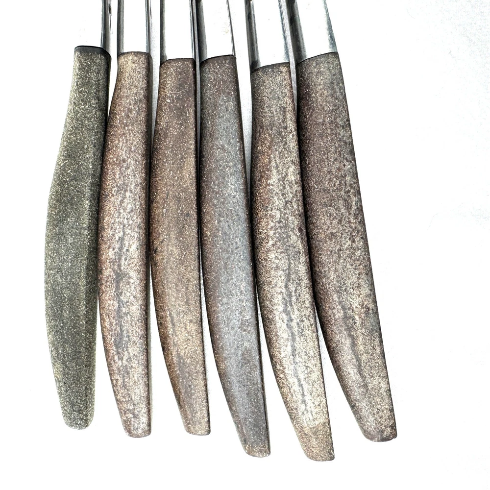 Offering a lot of 12 Interpur INR2 teaspoons 6.5” long, mid-century modern style, a discontinued pattern made in Japan. The brown synthetic handles are sturdy and have cracks, which look especially dark, having just been washed. The stainless steel is in good condition, no chips, dents, or disposal damage. There are surface scratches and wear consistent with normal use. Please view the photos for details and condition. Measurements and photo colors are approximate. For extra protection your items will be packed in plastic sleeves and shipped in a box. For combined shipping, request an invoice before paying. Shipping is your choice of USPS Ground Advantage or USPS Flat Rate Priority at the rate determined by eBay. Terms of Sale: Photos are of the actual item you will receive and is sold "as is". Placing an order is your agreement that you know what you are buying, have viewed the photos and find the condition acceptable. If you have any questions or concerns about your order, contact me through eBay Messages. Please inspect your item upon arrival and contact me if there are any problems so we may work out a solution, before you leave feedback or request a refund . No returns please.