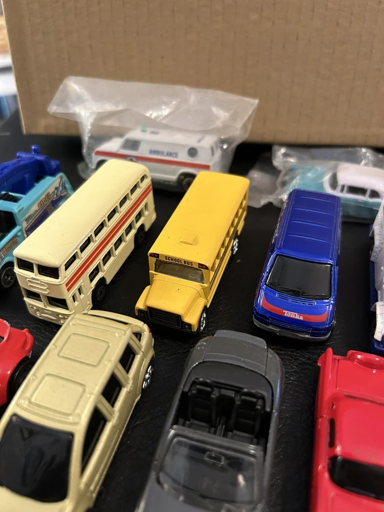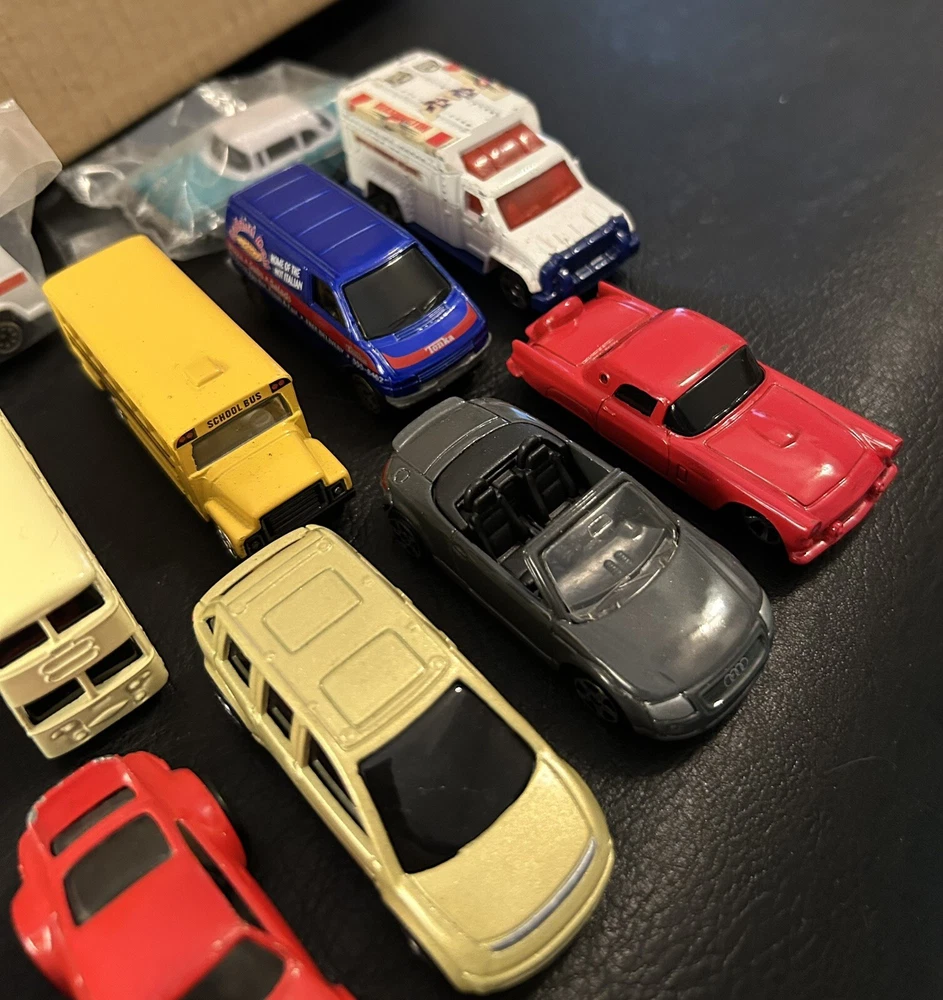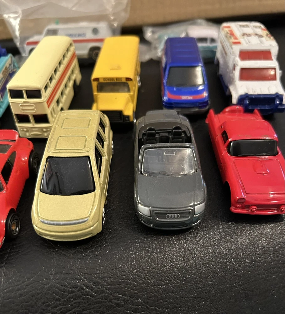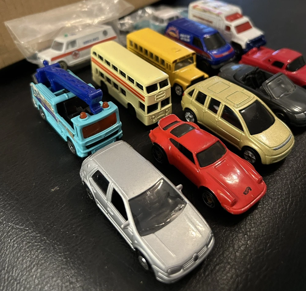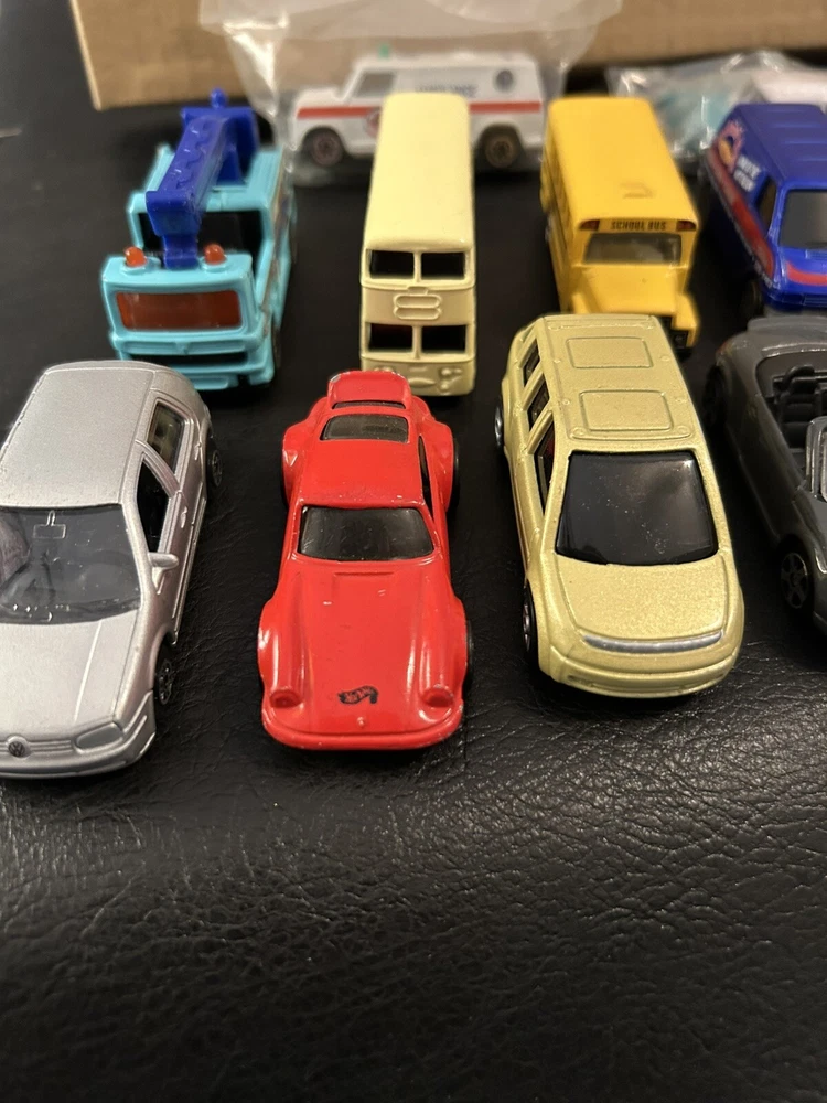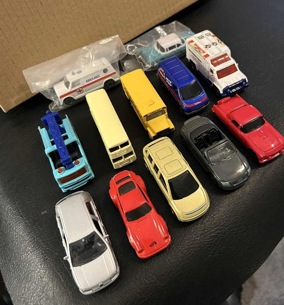 Lot of 12 vintage 1:64 scale die-cast cars includes Matchbox, Hot Wheels, Maisto, and Welly brands. The cars are multi-color and part of the Cars character family. Made of diecast material, these collectible vehicles are a mix of various models from different manufacturers.