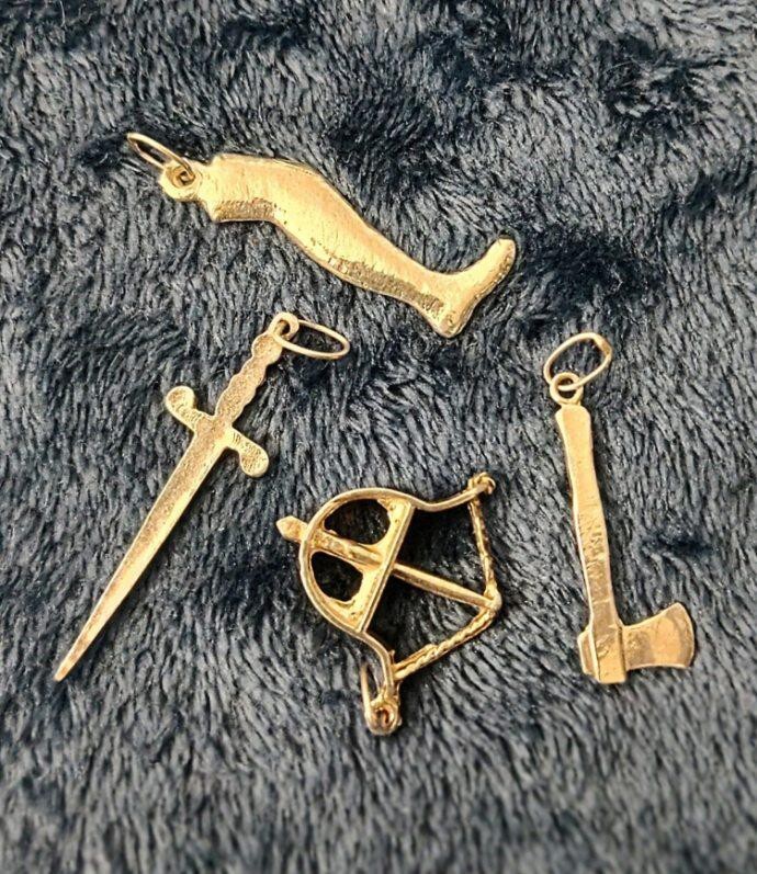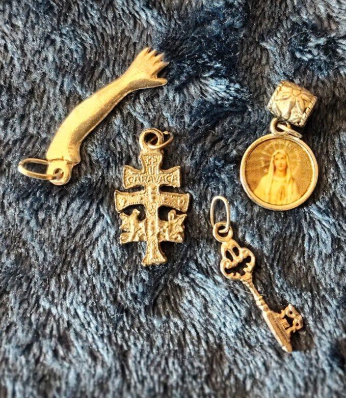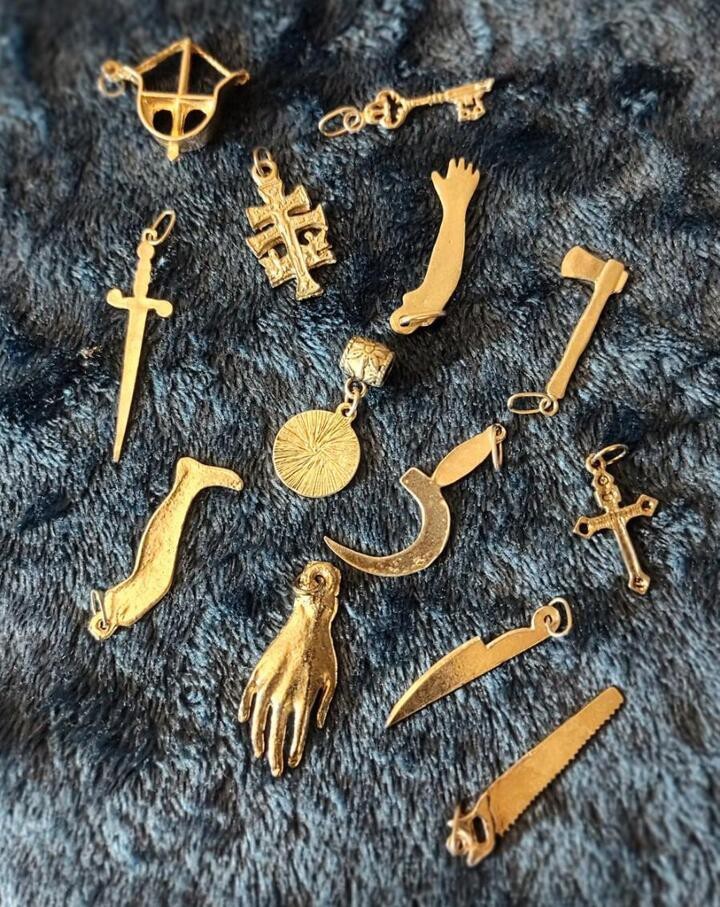 This lot of 13 pendant necklace pendants and bracelet charms offers a variety of styles and designs for jewelry making. The silver color and mixed metal material provide a versatile option for crafting unique and personalized pieces. Perfect for adding a touch of creativity to any necklace or bracelet project. Sword 1" Caravaca Cross 1" Knife 1" Leg 1.5" Arm .25" Mano Cornuto 1.5" Crucifix .75" Key .75" Bow & Arrow 1.15" Axe 1.25" Virgin 1" Saw 1.5" Sickle 1.25"