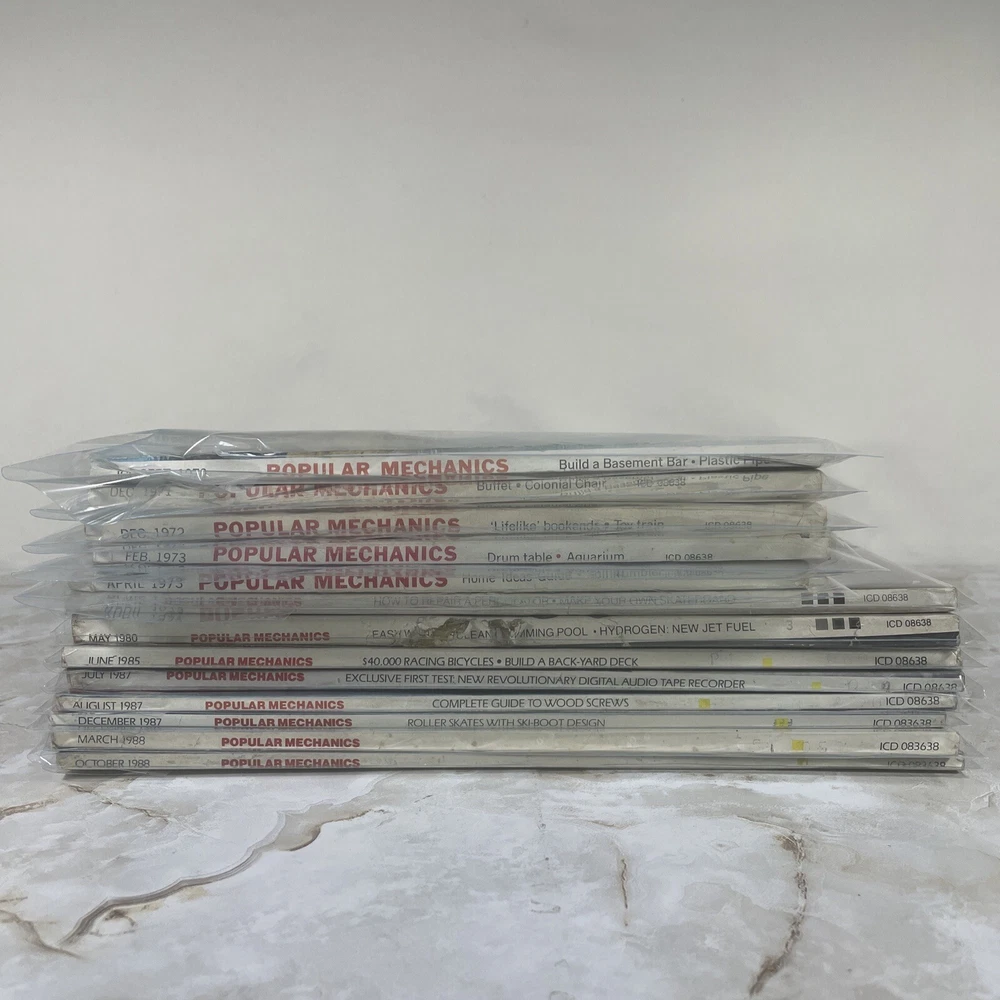 OLDER & FRAGILE, PLACED IN MAGAZINE POLY BAGS TO HELP PROTECT This lot consists of 13 vintage Popular Mechanics magazines from the 1970s and 1980s. The magazines cover a variety of topics including cars, aviation, hobbies & crafts, nautical, science, history, design, technology, mechanics, hardware, and transport. Each magazine is in English and is illustrated. The publication frequency is monthly. The magazines are not signed and are in good condition.