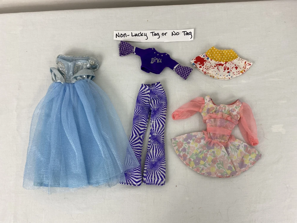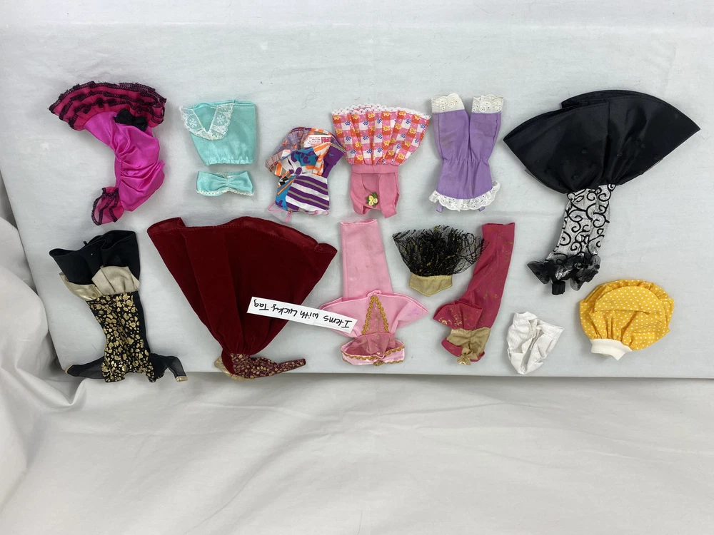 This lot includes 14 Lucky Brand Barbie clone outfits, featuring a mix and match collection of formal dresses, gowns,skirt, pants, and casual wear. The clothing styles are perfect for all occasions, whether for holidays, everyday wear, or special occasions. The outfits are compatible with 11 1/2 inch dolls, and the set weighs 0.4 lbs. The Lucky Brand Barbie clone outfits were manufactured in 1990-1999 and are original, vintage pieces. The clothing is made of lightweight cloth and does not require batteries. Examples of dolls that can wear this lot: Jazzie, Barbie, Midge, Teresa, and Stacie doll types, and the set comes with 14 Barbie clone looks that can be used for fashion and beauty themes. Please pay close attention to the pictures as they are considered part of the description. Sold as is, no returns.