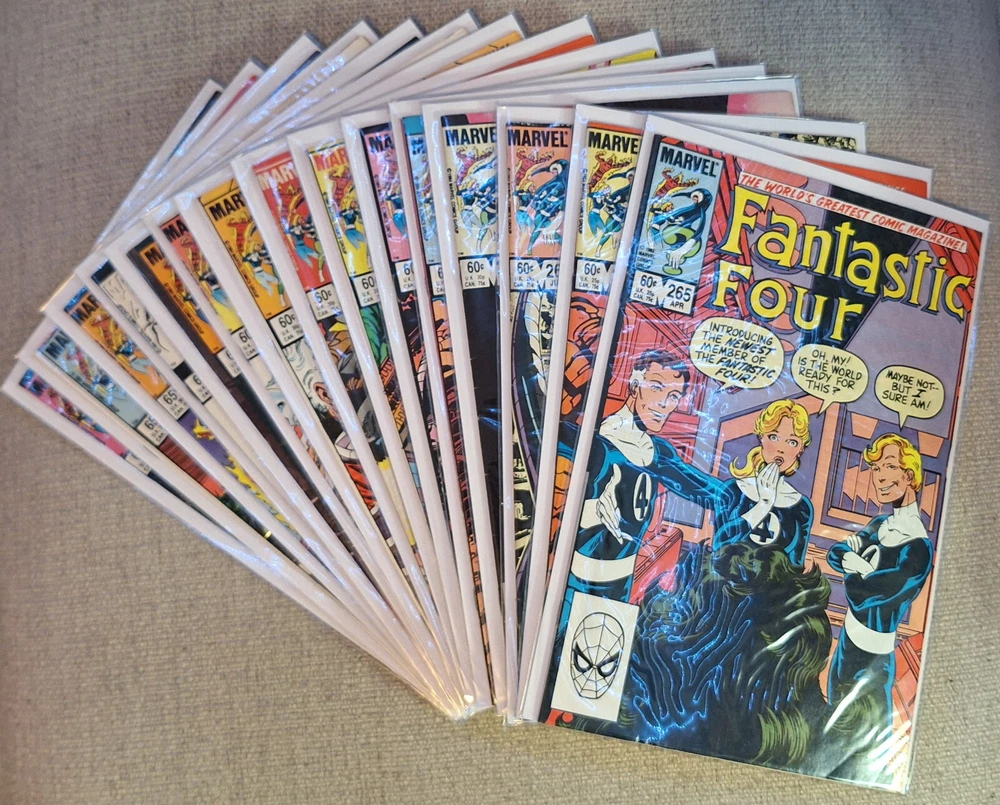 This lot includes 15 Marvel Comics featuring the Fantastic Four #265-#279 complete, art & story by John Byrne. The comics are in softcover format and include characters such as Human Torch (Johnny Storm), Invisible Girl (Sue Richards), She Hulk, and Mister Fantastic. The series title is Fantastic Four and the genre is Superheroes. The publisher is Marvel Comics and the tradition is US Comics. These comics are perfect for collectors and fans of the Fantastic Four superhero team. The lot falls under the categories of Comics & Graphic Novels, Comics, Comic Books & Memorabilia, and Collectibles. Don't miss out on the chance to add these rare comics to your collection! Books are all fine+. Minor spine ticks, minor corner bumps, very small creases, minor warping. (Note that wrinkling seen in pictures is from the bags and not the books.) I'm trying to be conservative with grading. Please see pictures for details on each issue. I am not a professional grader. Please message with any questions. Includes issue #'s 265-279 complete. 15 issues total. Please message with any questions. Please search my other listings under "comics" for more great books! I ship fast & securely. Please see my feedback!