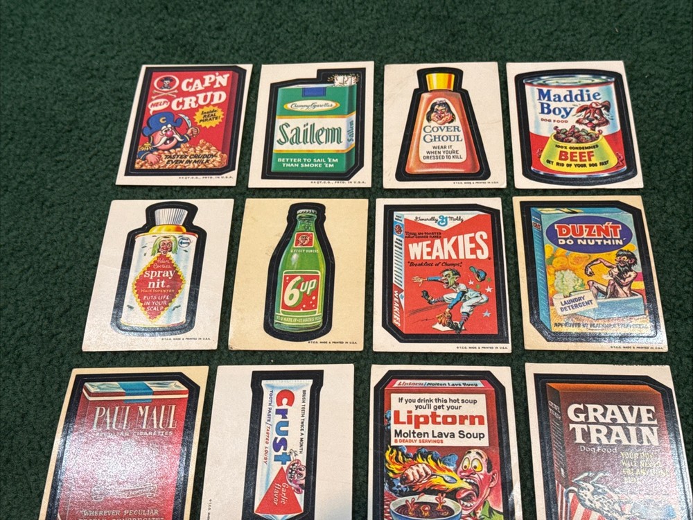You are bidding on a lot of 19 different 1973 Wacky packs Topps cards. This is a fun vintage lot. These are white backs from the first series put out by Topps. 16 original stickers and 3 that are rigid cardboard, maybe perforated from wax box. Cards in this lot may have centering issues, very minor corner, surface and or edge wear, wax/gum marks, etc. There are two stickers with creases. Average condition of this lot is EX or better. A handful may be EXMT or better. A couple are worse condition. Wonderful vintage Topps non-sport lot. Buyer pays $6.00 shipping. Shipping combined on multiple lots whenever possible. MN residents add 6.875% sales tax. Thanks for your purchases! Please check out my Ebay store for more great items!