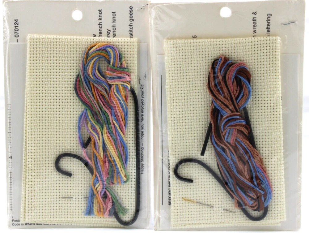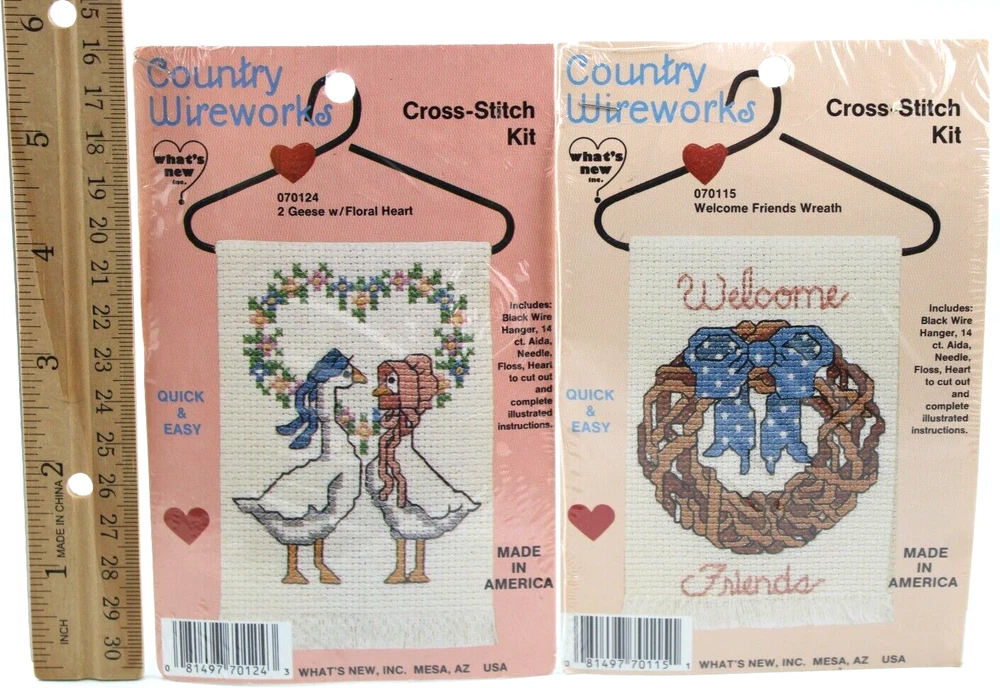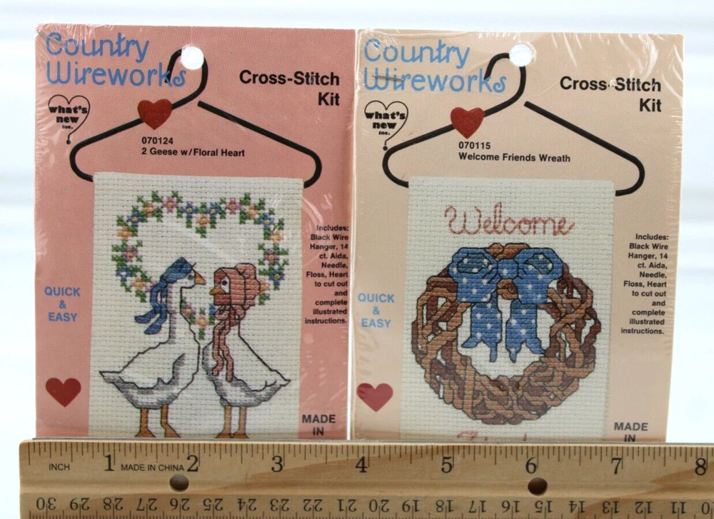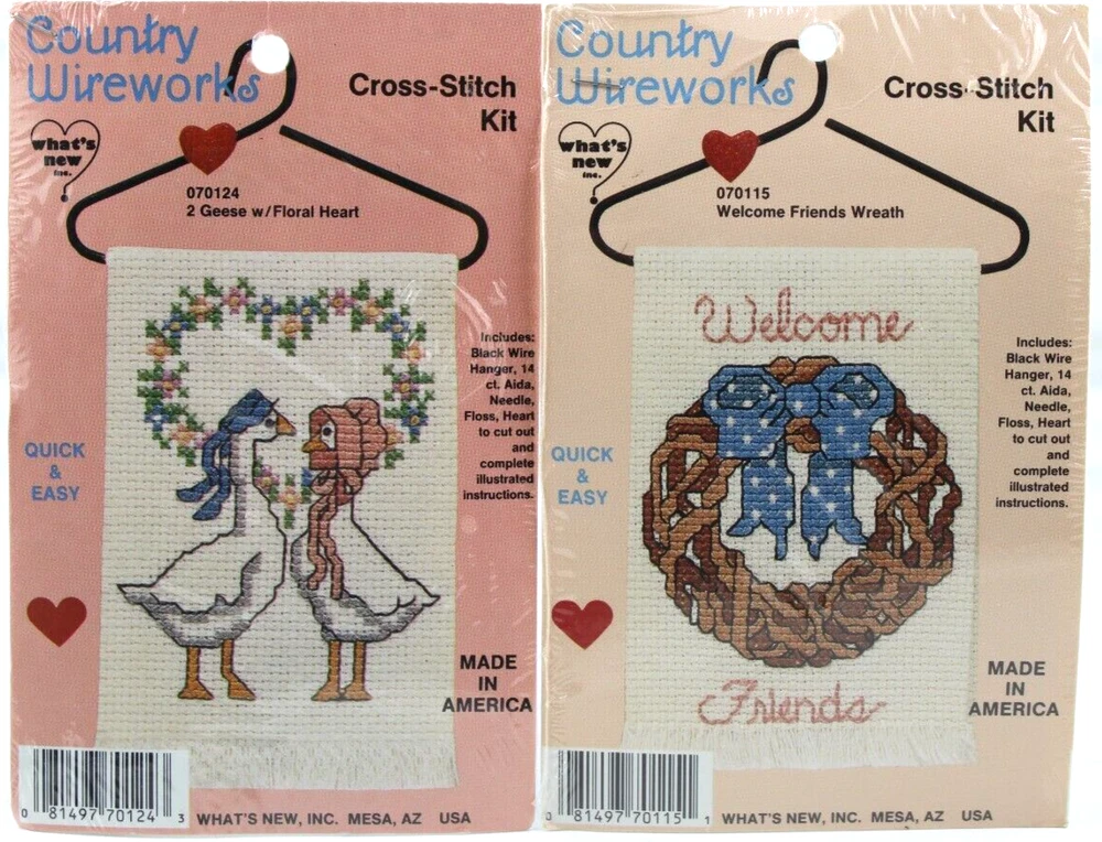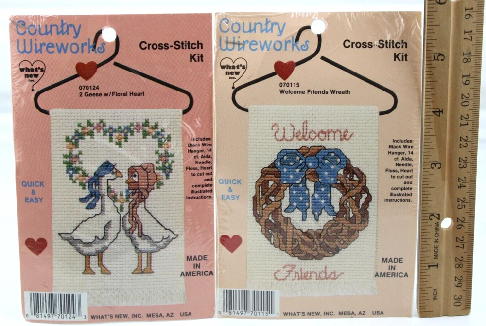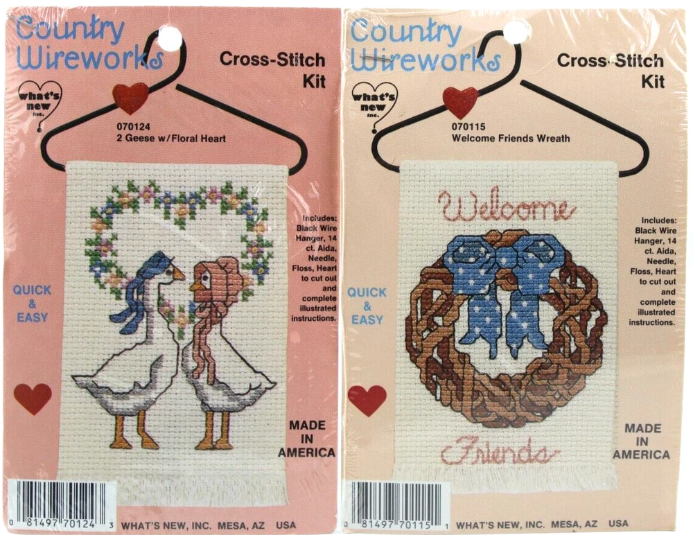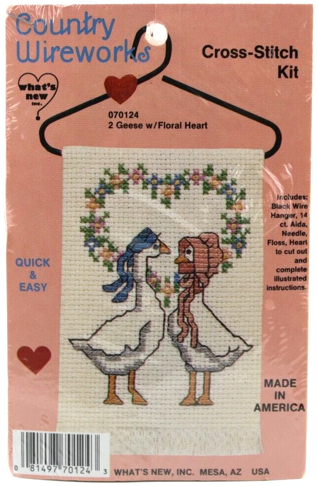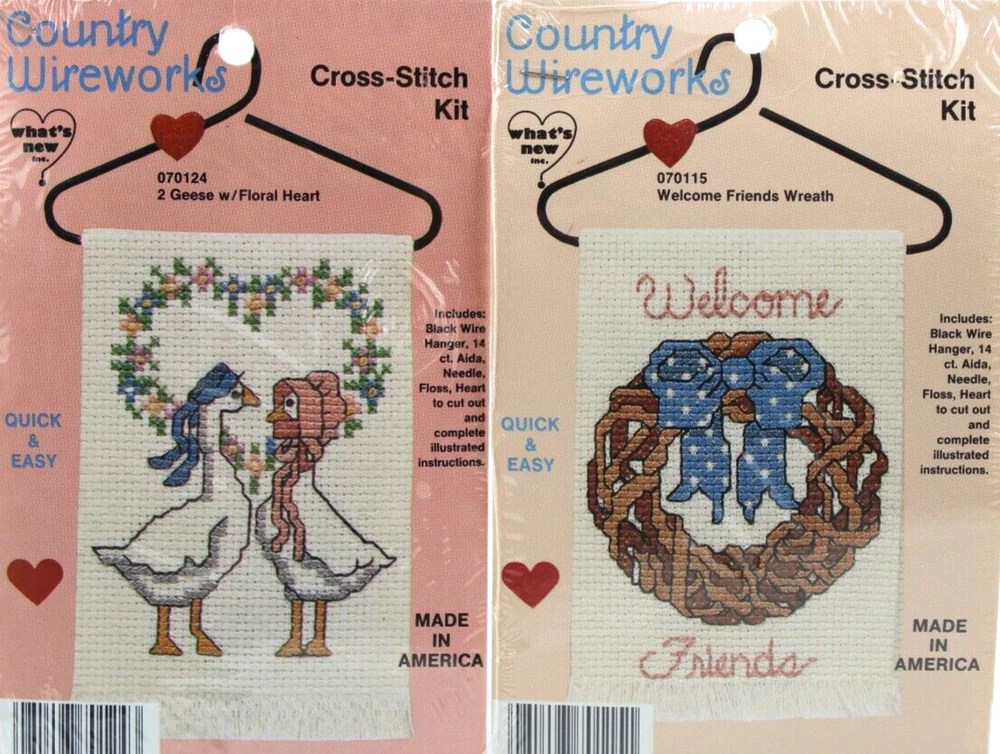 Lot of 2 Cross Stitch Kits Country Wireworks Geese Heart & Friends Wreath Sealed New Vintage 1980's LOT OF 2 VINTAGE NEW SEALED CROSS STITCH KITS CONTAINS; 070124 GEESE WITH FLORAL HEART CROSS STITCH KIT 070115 WELCOME FRIENDS WREATH CROSS STITCH KIT QUICK AND EASY INCLUDES BLACK WIRE HANGER, 14 CT AIDA, NEEDLE, FLOSS, HEART TO CUT OUT COMES WITH COMPLETE ILLUSTRATED INSTRUCTIONS MADE IN AMERICA 1980S SEALED NEW, MINOR SIGNS OF SHELF WEAR TO EXTERIOR PLASTIC WRAP WOULD MAKE A GREAT GIFT ✨✨✨✨✨✨✨✨✨✨✨ The VinKris Collection is committed to delivering a great experience! We will ship to you with the greatest of care All items are shipped in sturdy boxes We use packing materials appropriate for the product to help ensure safe delivery Shipments to the United States and Protectorates are handled via USPS International shipments will ship via Ebay's International Shipping Program All packages are shipped within 1 business day of payment We ship daily Monday through Saturday Worry free purchases, we stand behind everything we sell with free 30 day returns We have thousands of happy customers and our goal is 100% customer satisfaction We are happy to answer any questions