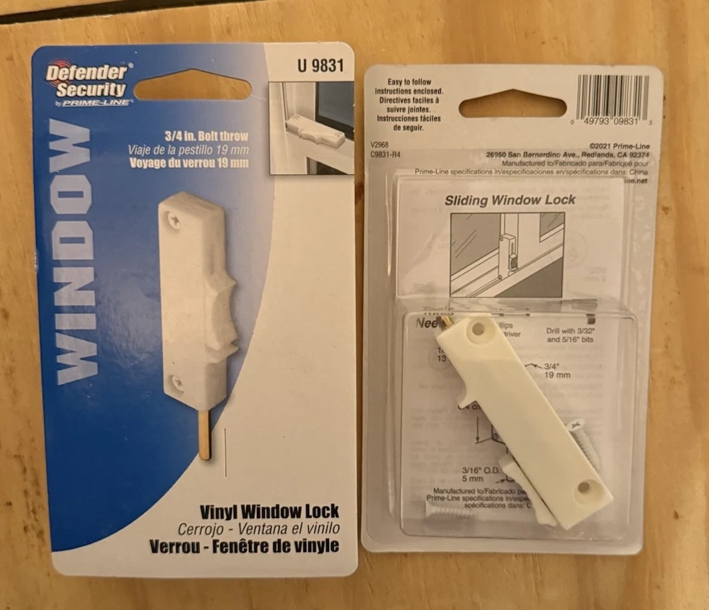 This is a Prime Line Products Defender Security vinyl window lock in white, designed for Lock & Lock sliding windows. The model number is U-9831, and it is suitable for use in home improvement and building projects. Lot of 2