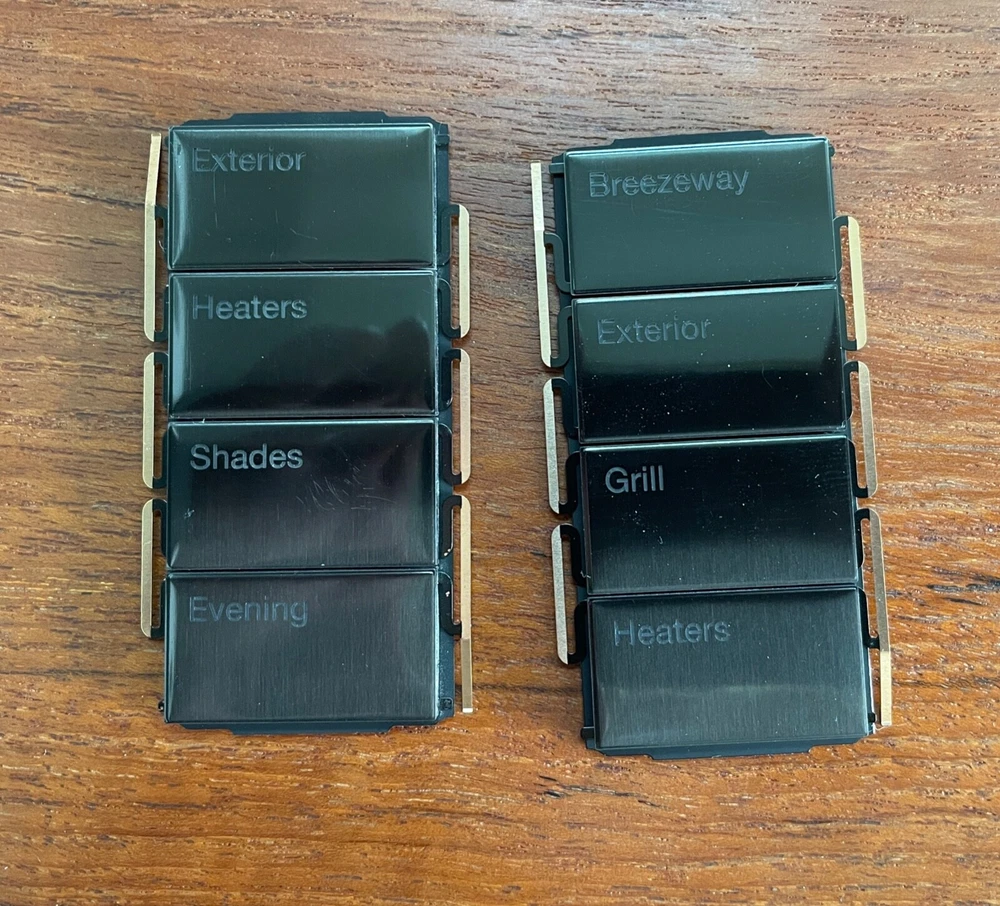 Lot of 2 Lutron Palladiom pre-engraved 4-button kit in Architectural Metal Polished Graphite. Exterior / Heaters / Shades / Evening. Breezeway / Exterior / Grill / Heaters. Slight scratches on the "Shades" button, but hardly visible. Button kit only.