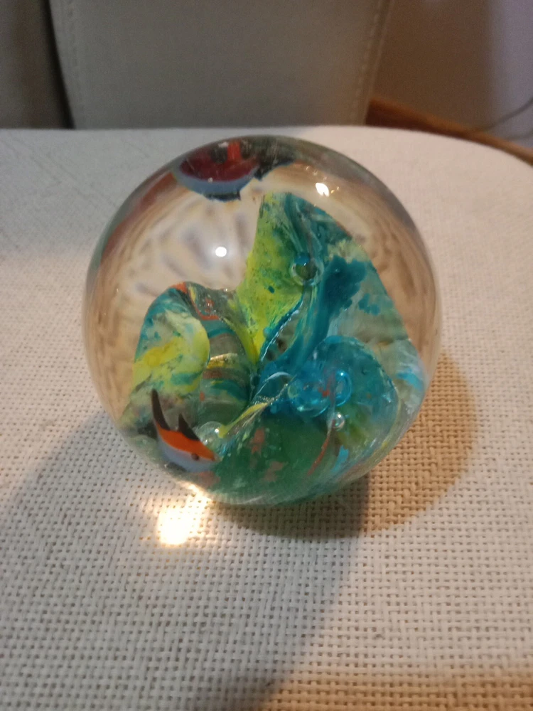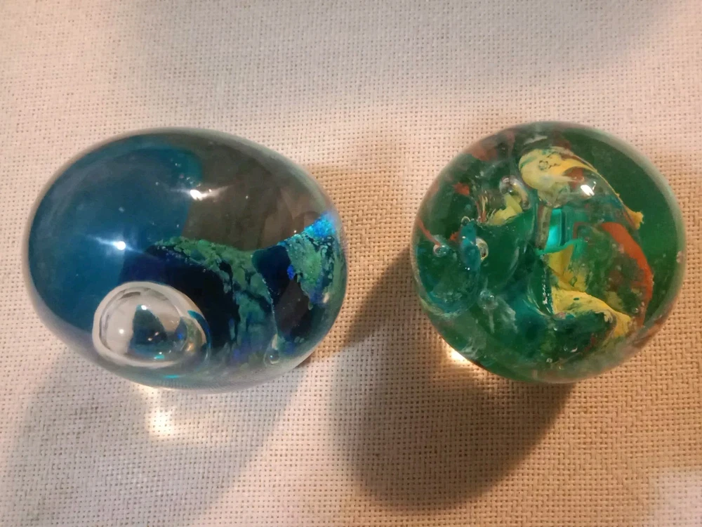 This lot of two modern art glass paperweights features a beautiful fish aquarium design, perfect for any lover of marine life. The larger paperweight stands at 4 inches tall and the smaller one at 3 inches, making them ideal for display on any shelf or desk. The multicolored glass and intricate production style of these paperweights make them true works of art. Crafted in the 1990s, these paperweights are unmarked and their era is unknown. They are, however, perfect for collectors of paperweights and those who appreciate unique and beautiful decorative items. Add a touch of the ocean to your home with this stunning pair of paperweights.