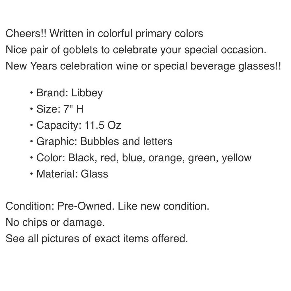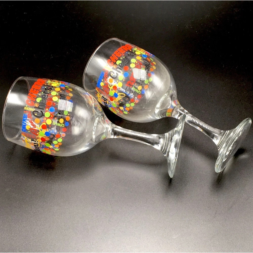 Cheers!! Written in colorful primary colors Nice pair of goblets to celebrate your special occasion. New Years celebration wine or special beverage glasses!! • Brand: Libbey • Size: 7" H • Capacity: 11.5 Oz • Graphic: Bubbles and letters • Color: Black, red, blue, orange, green, yellow • Material: Glass Condition: Pre-Owned. Like new condition. No chips or damage. See all pictures of exact items offered.