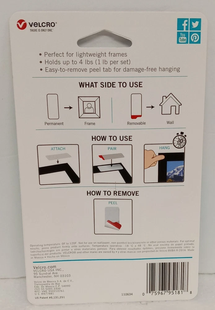 Lot of 2 Velcro Hangables Removable Wall Fasteners 4 Sets Each # 95181