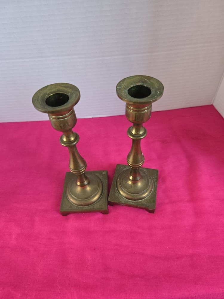 This lot of 2 vintage 6" solid brass candlestick holders features a mid-century modern design, perfect for any room in your home. The round shape and antique brass finish add a touch of elegance to your space. These candle holders are suitable for furniture and can be cleaned with a damp cloth, making them easy to maintain. The marking on the bottom indicates the brand as "W", adding a unique touch to these collectible decorative pieces. The gold color and medium size make them versatile for all occasions.